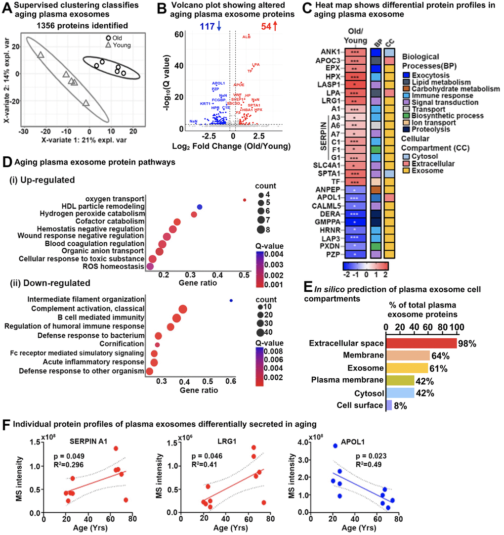 Distinct and separate clustering of protein profiles from plasma exosomes from young and old individuals were revealed by PLS-DA (Figure 4A). Volcano plots of old versus young (old/young) individuals showed 171 significantly altered exosome proteins (q-value ≤ 0.05, |log2fold change| ≥ 0.58), of which 117 were down-regulated, whereas 54 were up-regulated in the older individuals (Figure 4B and Supplementary Table 4C). A selection of key importance up- and down-regulated aging plasma exosome proteins (26) are shown in Figure 4C. Top up-regulated proteins included LIM and SH3 domain protein 1 (LASP1), Hemopexin (HPX), Eosinophil peroxidase (EPX), Band 3 anion transport protein (SLC4A1), Leucine-rich alpha-2-glycoprotein (LRG1), as well as several Serpins. Top down-regulated proteins were Calmodulin-like protein 5 (CALML5), Deoxyribose-phosphate aldolase (DERA), Peroxidasin homolog (PXDN), Aminopeptidase N (ANPEP), and Apolipoprotein L1 (APOL1). Out of them, 80% are classified as exosome proteins, demonstrating the high yield and purity of the extracted plasma exosomes, and span nine different biological processes, such as exocytosis, immune response, signal transduction, and proteolysis (Figure 4C).