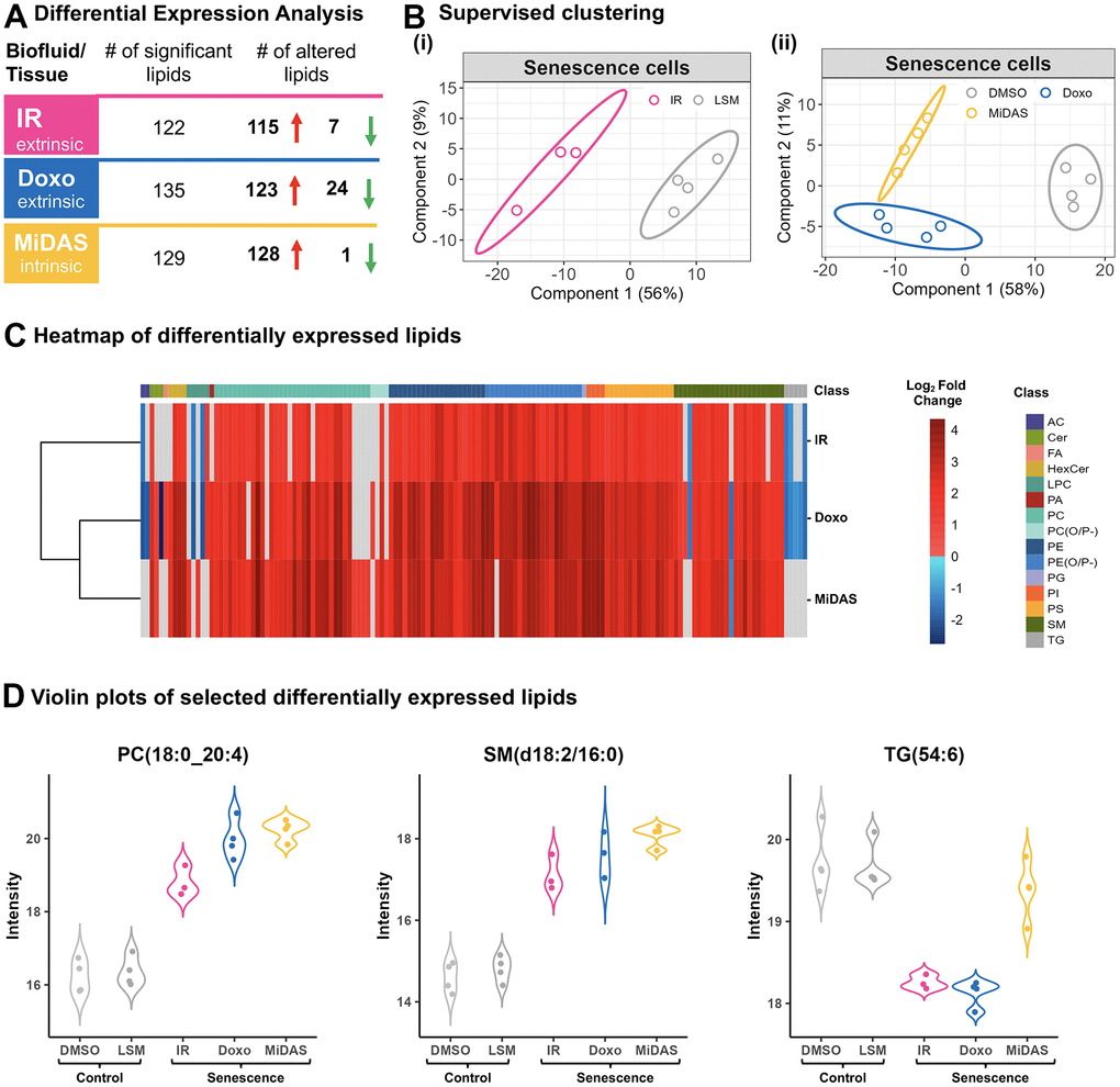 For the lipidomic comparative analysis, the lipid intensities were total ion chromatogram (TIC) normalized and log2 transformed. To assess clustering, PLS-DA was performed using the package ‘mixOmics’. Significant lipids were identified in R using the package ‘limma’, which employs linear models to assess differential expression in complex experiments. The resulting p-values were adjusted using Benjamini-Hochberg correction and fold changes were log2 transformed. A heatmap of significant lipids was created using the package ‘pheatmap’ and group clustering was assessed using Euclidean distance and complete linkage. Finally, violin plots were created using the package ‘ggplot2’. The exported statistical outputs, including log2 fold changes and p-values for the IR vs. LSM (Qui), doxo vs. DMSO, and MiDAS vs. DMSO comparisons are provided in Supplementary Table 5B, 5C.