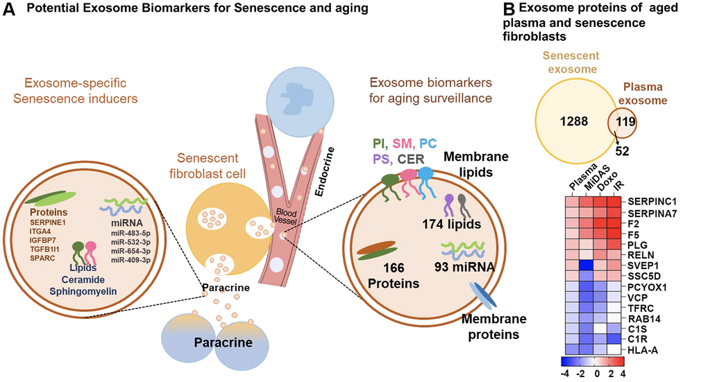 We performed a comprehensive proteomic analysis of exosomal SASP components from senescent primary human lung fibroblast cells (IMR90) induced by three different stimuli, irradiation (IR), doxorubicin (doxo), and Antimycin A-induced MiDAS. Furthermore, we profiled the proteome and miRNA contained in exosomes from plasma from young (20-26 years old) and older (65-74 years old) individuals (Figure 1). It should be noted that this cohort was relatively small with 5 young and 5 elderly participants.