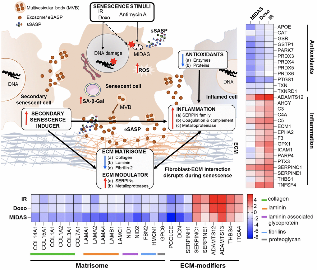 Cellular senescence is considered a crucial mechanism of aging because senescent cells accumulate in different tissues over time and contribute to the aging process [4]. Senescence is the process by which cells become cell cycle arrested while still staying viable, metabolically active, and undergoing distinct phenotypic alterations. Senescence can be induced by various intrinsic factors, such as telomer shortening (Hayflick’s limit) [5], by extrinsic factors, such as irradiation (IR) and chemical reagents (e.g., doxorubicin, doxo), or via Mitochondrial Dysfunction-Associated Senescence (MiDAS) [6, 7]. The various senescence inducers all exhibit varied modes of action, for example, irradiation causes double-stranded breaks in DNA [8], doxorubicin induces DNA cross-linking [9], while disruption in normal mitochondrial function results in MiDAS [6]. Senescent cells exert their pleiotropic biological effects by secretion of senescence-associated secretory phenotype (SASP) [10–12]. The SASP represents a myriad of pro-inflammatory molecules, growth factors, extracellular matrix (ECM) metalloproteinases, microRNAs, and lipids that are either directly secreted or packaged into exosomes [13–15].
