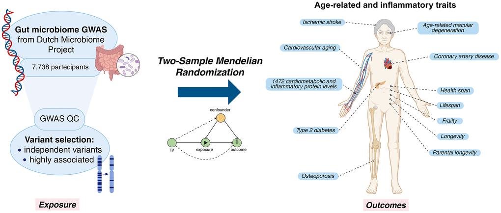 To investigate potential causal links between the gut microbiome and age-related traits and proteins, the two-sample Mendelian Randomization (MR) technique was employed, a causal inference approach that uses genome-wide association study (GWAS) data to infer causal relationships while controlling for confounding factors and reverse causality. Other studies [4–10] have used MR to assess the causal relationships between gut microbiome and specific age-related traits. For example, Mao et al. [6] investigated its causality with age-related macular degeneration; Chen et al. [7, 10] explored links with longevity traits; and Bo et al. [8] focused specifically on frailty. In our work, we opted for a comprehensive analysis with an extensive number of age-related outcomes (Figure 1). Furthermore, we emphasized the importance of a rigorous approach to MR analyses. This involves (i) employing GWAS carried out on large data set to ensure sufficient statistical power, (ii) the use of stringent parameters to ensure validity of MR assumptions such as the independence and strong association of the instrumental variables (IVs), (iii) performing multiple testing correction and sensitivity analysis, and (iv) exclusion of reverse causality bias via bidirectional MR. Moreover, our study followed the STROBE-MR (Strengthening the Reporting of Observational Studies in Epidemiology using Mendelian Randomization) checklist [11] and guidelines from Burgess et al. [12].
