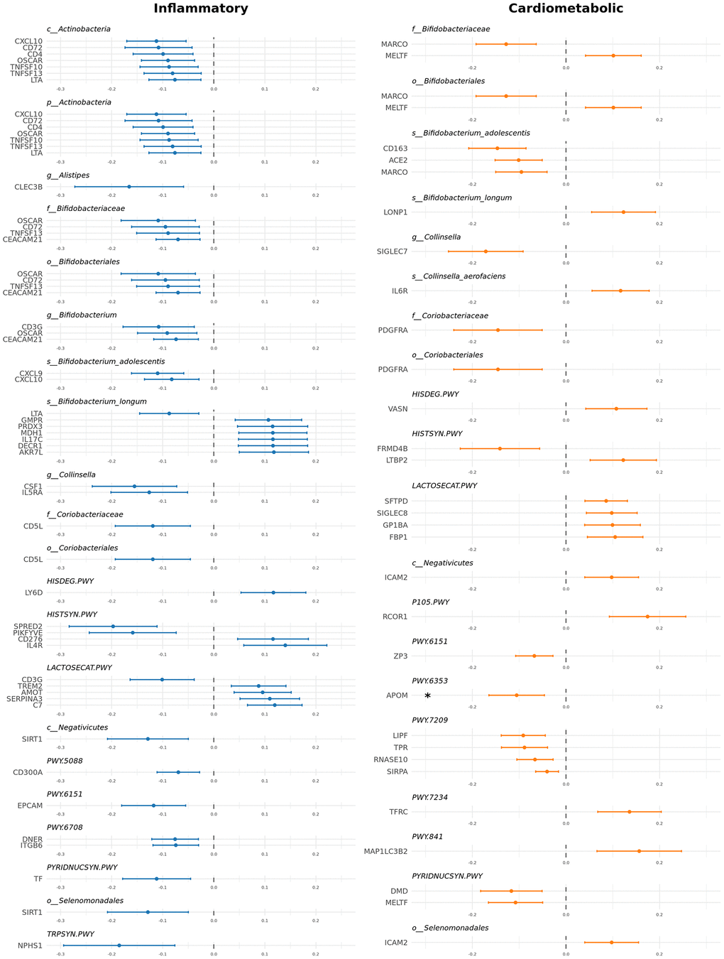 The GWAS summary statistics for circulating inflammatory and cardiometabolic proteins refer to the study of Sun et al., 2023 [16], which analyzed a total of 2923 proteins in 54219 UK Biobank participants (Supplementary Table 1B). Among all these proteins, we analyzed as outcomes a total of 1472 proteins from the inflammatory and cardiometabolic panels, markers of interest for our study. Out of all the 54464 MR analyses carried out with the 37 microbiome features, 89 showed significant MR results after FDR correction (adjusted p < 0.05) and all sensitivity analyses, including bidirectional MR (Supplementary Table 2J).