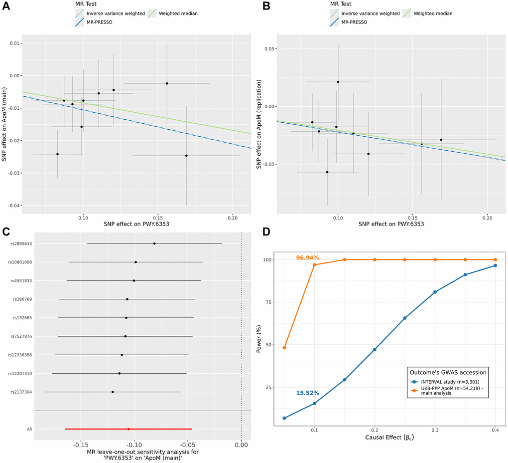We replicated significant causal relationships for proteins for which GWASs were available in other studies. Specifically, we used three key datasets: Zhao et al. [19], Sun et al., 2018 [20], and Folkersen et al. [21] (Supplementary Table 1C). A relationship was considered replicated if the IVW p-value was less than 0.05 and the direction of the effect was consistent with our main analysis. With these criteria, we found that the causal relationship between the purine nucleotides degradation II aerobic pathway and apolipoprotein M (ApoM) was replicated using the ApoM GWAS from Sun et al., 2018 [20] (GCST90240318) (Figure 3). In particular, in both analyses an increase in pathway abundance was causally linked with a decrease in ApoM circulating levels (main analysis: βc = −0.11, pBH = 0.02; replication analysis: βc = −0.22, p = 0.01). All other results are detailed in the Supplementary Table 2K.