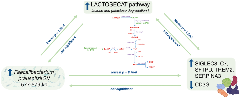 We further investigated the underlying biological meaning of the significant causal relationships between the lactose-galactose degradation I pathway (LACTOSECAT) pathway, and plasma protein levels, being this pathway strongly associated with a genetic variant in the ABO gene [22]. We therefore aimed to investigate whether the causal relationships observed in our study might be connected to the utilization of N-acetylgalactosamine (GalNAc) in blood type A individuals, since a recent study from our collaborators [23] showed that strains of ABO-associated species, such as strains of Faecalibacterium prausnitzii, can utilize this sugar from individuals who secrete the mucosal A-antigen.