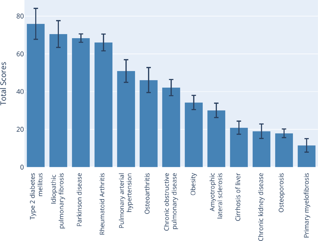 Our study utilized a custom approach to analyze and compare ARDs by integrating data from multiple sources (see Figure 4). Disease-associated target genes were acquired through the Open Targets Platform [110], which aggregates evidence of target-disease associations from scientific literature. Only high-evidence (target score>0.4) genes were considered in the enrichment analysis. Out of the genes passing the threshold, we randomly selected 50 out of top-60 to calculate the partial hallmark scores and the total scores. This procedure was repeated 250 times for each disease to get 95% confidence intervals of the scores and to derive statistical significance of non-zero hallmark scores. The distributions of partial hallmark and total scores are available in Supplementary Material 1. For partial scores on Figure 1, q-values were calculated with Benjamin-Hochberg correction to test the alternative hypothesis that the true hallmark score is greater than zero. All scores presented in the figures are normalized relative to the maximal score achieved in sampling.