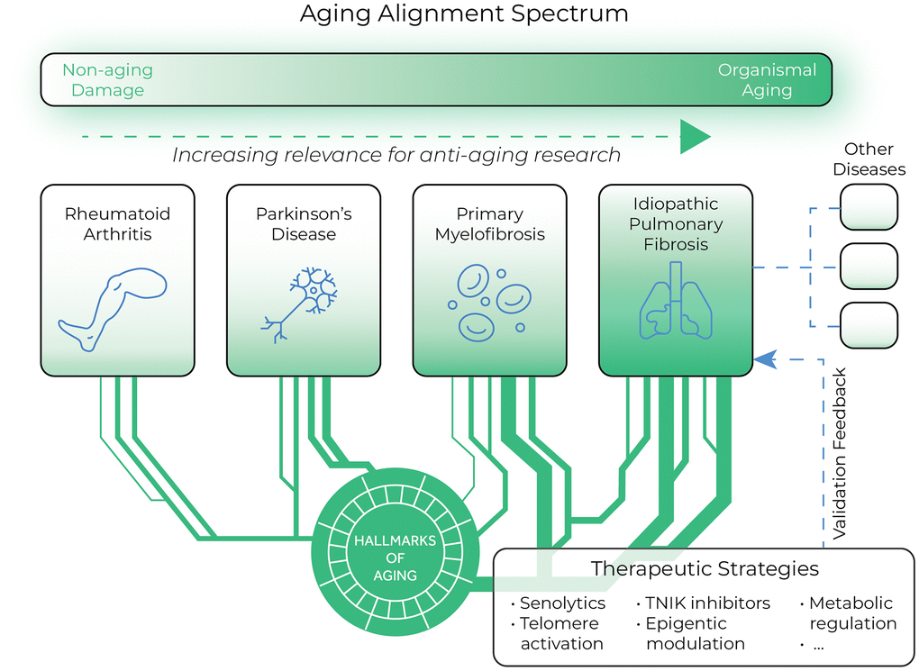 The incidence of IPF rises sharply with age, satisfying the epidemiological definition for ARDs [51]. In addition, IPF is driven by practically all hallmarks of aging jointly contributing to its debilitating effects on the patient [44]. This intersection of clinical urgency and high aging alignment makes IPF a uniquely attractive platform for testing anti-aging interventions.
