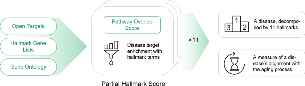 We argue that aging biology should be considered early in the drug design process, rather than addressed only later through repurposing efforts. The deconvolution of disease-hallmark interactions proposes a more flexible and robust alternative to the disease-centric mode of drug development. The specific approach presented here should be treated as one of many possible options for disease-hallmark annotation, with future improvements possible through additional data sources and methodological refinements.