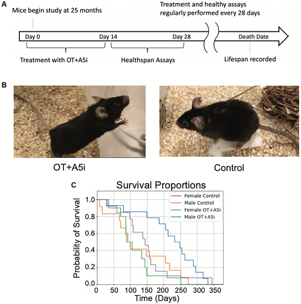 To determine the longitudinal effects, 12 male control, 14 male OT+A5i, 13 female control, and 10 female OT+A5i animals were studied. The rationale for this combinatorial two drug treatment and the doses of the OT and A5i were chosen based on the dose-curve studies of the acute short-term rejuvenation [27]. The mice began the study at 25 months of age (see Materials and Methods for details) and were already frail; and they were randomly assigned to the experimental or control groups.