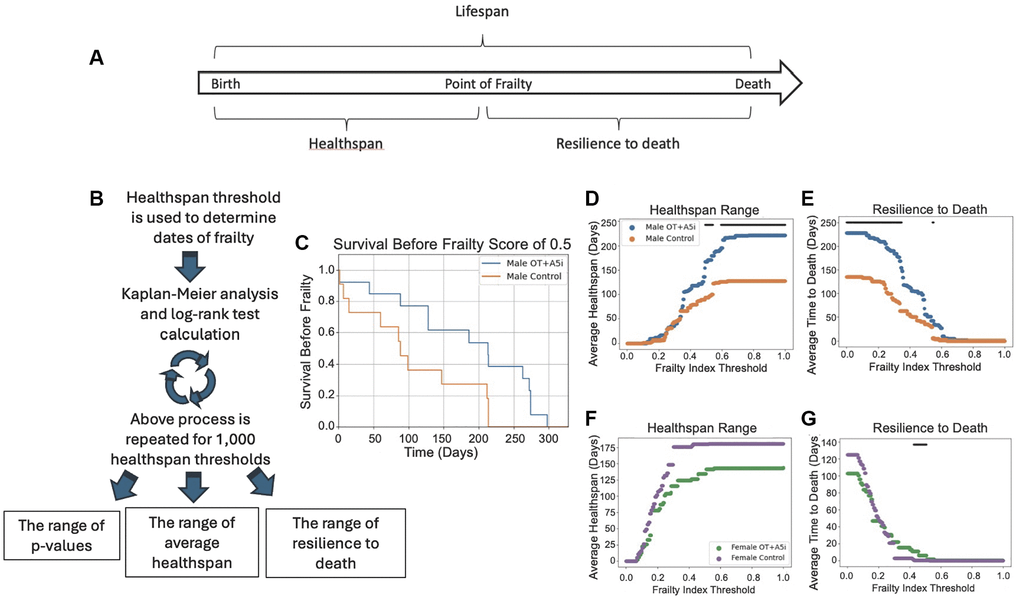 The statistical analysis we used was a novel method to evaluate overall healthspan at a range of frailty points. For every metric of health, we determined the range of all points of frailty and proceeded to calculate at which point in time each animal passed these points of frailty. Within the range of points, 1000 equidistant different points were selected, and each was used to calculate a log-rank test statistic and the average time from the beginning of the study (25 months for mice) until the time point is graphed as the average healthspan. The logrank test is specifically built for longitudinal studies and inherently accounts for dropout of data-points, which is why it was used. P-values depicting the ranges at which the improvements to healthspan were statistically significant are graphed.