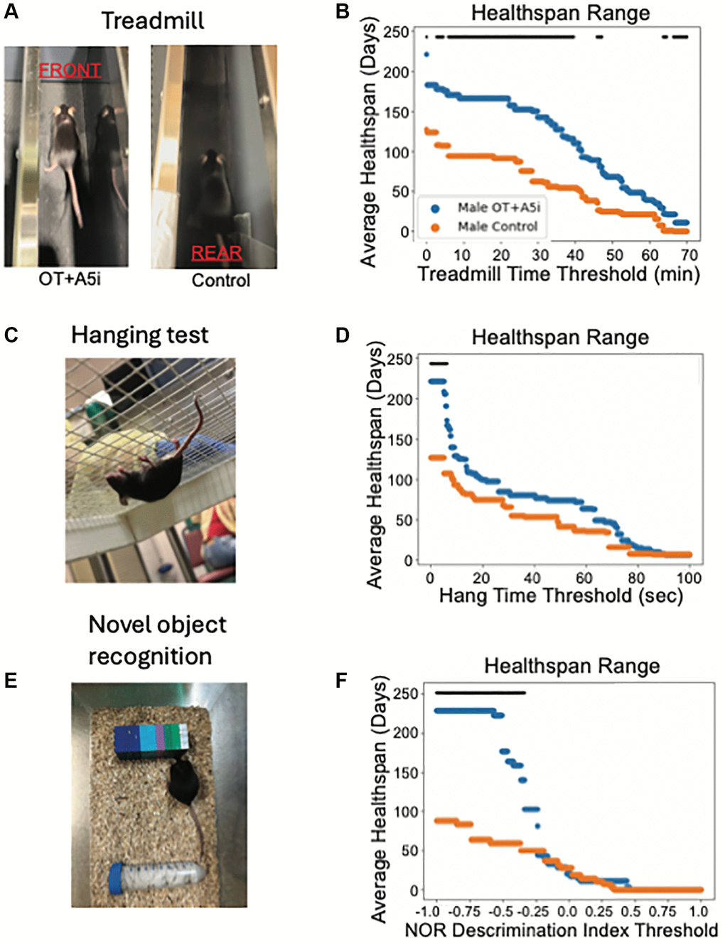 In addition to lifespan, we studied the healthspan of the aged frail mice that were longitudinally administered with OT+A5i or HBSS control. During the 2-week rest intervals between the OT+A5i treatments, health tests were performed including treadmill, novel object recognition, 4-limb hanging tests, and multiplex frailty scoring (Figure 2A).
