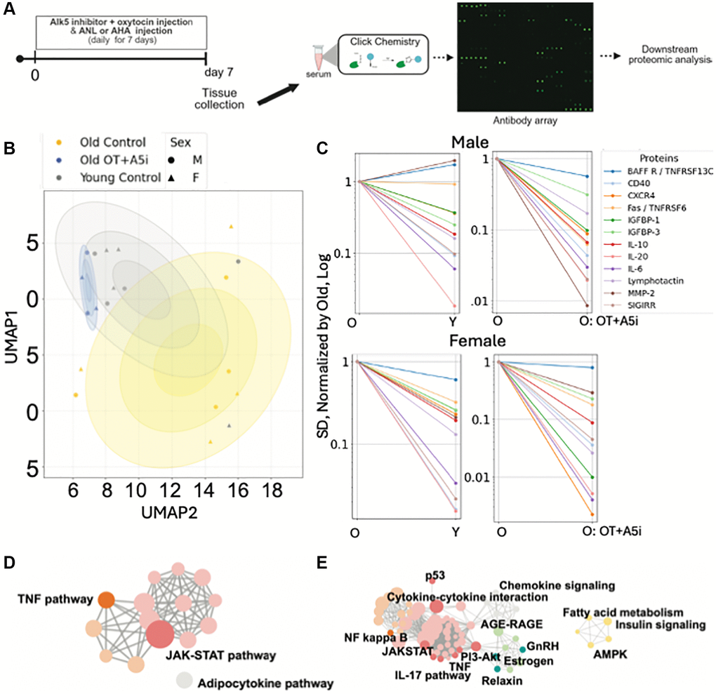 Based on Kyoto Encyclopedia of Genes and Genomes (KEGG) bioinformatics, the de-novo synthesized youthfully normalized by OT+A5i signaling determinants of TNF and JAK-STAT pathways were the top enriched terms (Figure 4D). With respect to the age-altered and OT+A5i normalized systemic determinants of protein noise, NF kappa B, JAK-STAT, PI3-Akt, TNF, AGE-RAGE, and AMPK, were highly enriched (Figure 4E). Supplementary Figure 4 shows additional analyses of this comparative de-novo proteomics via the sex-annotated Heatmap on DEPs and the merged between males and females protein noise curves. The full BONCAT data are provided in the Supplementary Data 1.