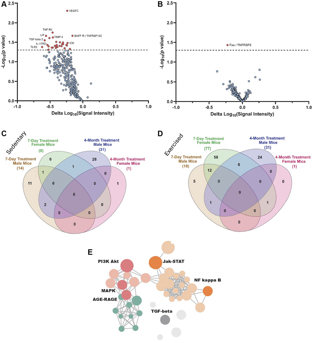 The Venn diagram was generated from values from normalized antibody array data using InteractiVenn [82]. Proteins were selected from each of the groups (1) 7-day treated male mice (sedentary and exercised), (2) 7-day treated female mice (sedentary and exercised), (3) 4-month treated male mice, and (4) 4-month treated female mice, if their p-value was significant (p > 0.05) compared to their group and gender-matched vehicle controls. Textual changes were made with Illustrator.