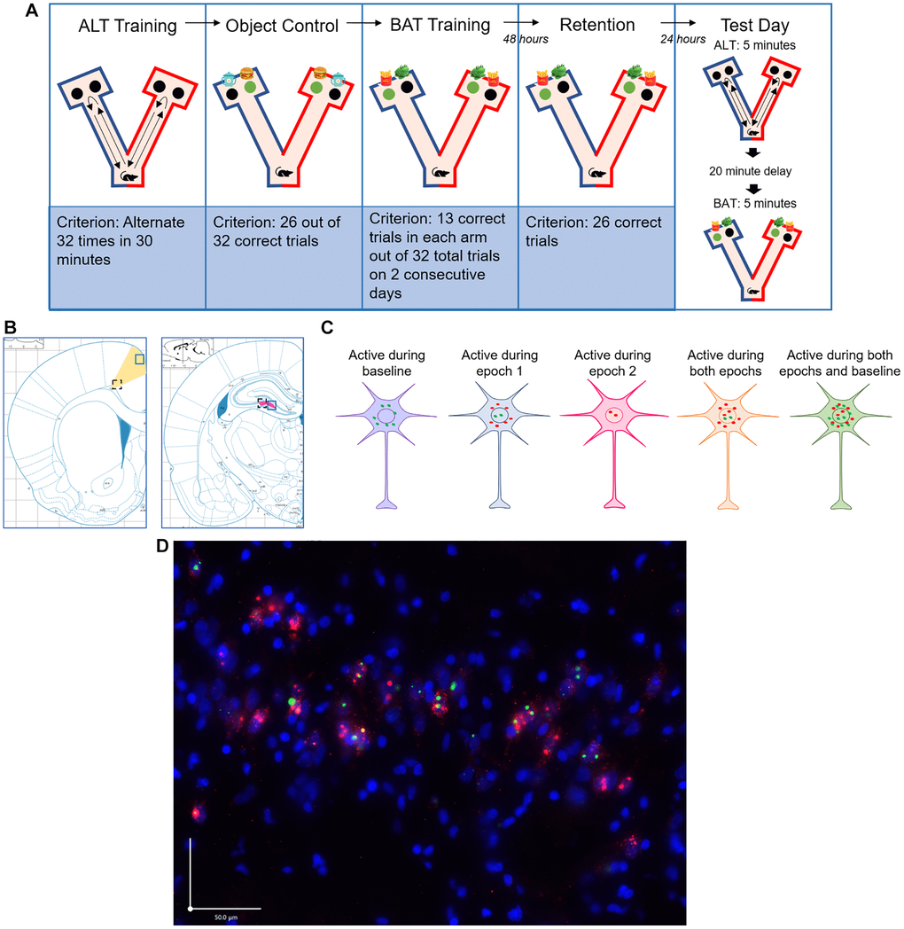 Anne Dankert was responsible for performing catFISH and microscopy procedures, planning and conducting statistical analyses, and writing the manuscript. Abbi Hernandez provided insight while designing the study, provided methodological training for catFISH and microscopy procedures, assisted with planning statistical analyses, and helped revise the manuscript. Taylor Wise, Katrina Dayaw, and Judith Dayaw collected BAT behavioral data and assisted with revising the manuscript. Rachael Layden assisted with data analysis and revising the manuscript. Katelyn Lubke sliced and mounted brain tissue, aided with catFISH quantification, and provided revisions to the manuscript. Sara Burke contributed to the study conception and design, oversaw catFISH and microscopy procedures, assisted with planning statistical analyses, and provided revisions to the manuscript. Victoria Templer was responsible for the conception and design of the study, oversaw BAT behavioral procedures and tissue collection, assisted with planning statistical analyses, and provided revisions to the manuscript. All authors approved the final version of the manuscript to be submitted to Aging-US.