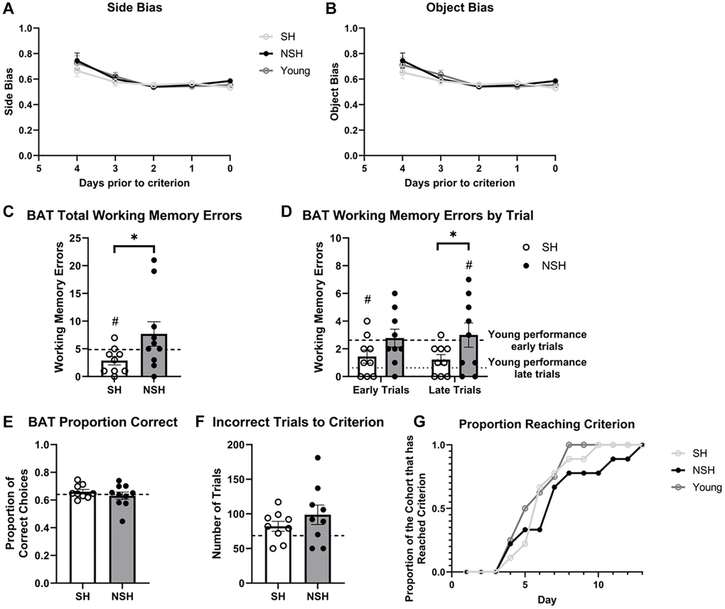 Three behavioral measures during BAT were analyzed: number of working memory errors (i.e., re-entries into the previously baited arm), proportion of correct choices for each task, and number of incorrect trials until criterion was reached. The a priori hypothesis was designed to examine the effect of long-term social housing on cognitive decline in old age and proposed that aged SH rats would show less cognitive decline than NSH rats. One-tailed independent samples t-tests between the aged SH and aged NSH rats were conducted to test this hypothesis.