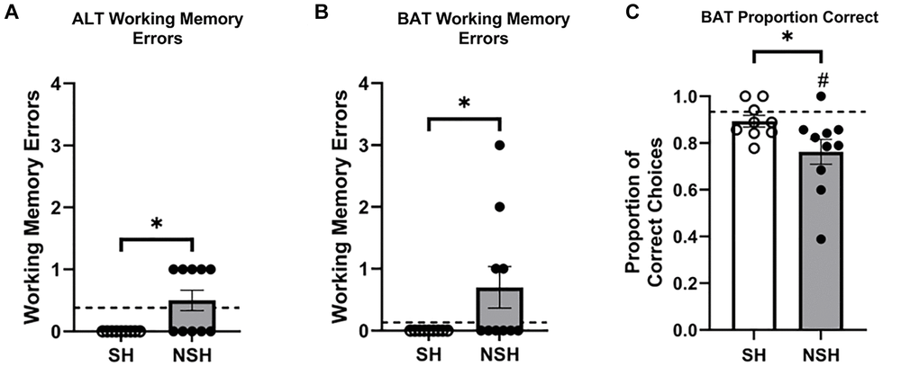 On BAT test day, NSH animals did not differ from the young population average in number of working memory errors made during ALT (t(9) = 0.750, p = 0.472, d = 0.237, Figure 3A) or during BAT (t(9) = 1.716, p = 0.120, d = 0.543, Figure 3B). Analysis of working memory errors made by SH animals compared to the population was not possible because all SH animals made zero working memory errors during ALT and BAT. Interestingly, NSH rats had a significantly lower proportion of correct choices during the BAT test compared to the population (t(9) = −3.501, p = 0.007, d = −1.107, Figure 3C), while the SH rats did not perform differently than average (t(8) = −1.216, p = 0.259, d = −0.405, Figure 3C). The order in which the rats performed the ALT and BAT tests did not significantly influence the proportion of correct choices made during the BAT test across groups (main effect of task order: F(1,21) = 0.001, p = 0.970, η2 = 0.000) or within group (interaction: F(2,21) = 2.631, p = 0.096, η2 = 0.200), indicating that the order of testing had no differential impact on the results obtained.