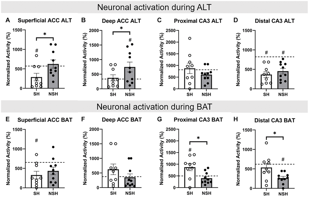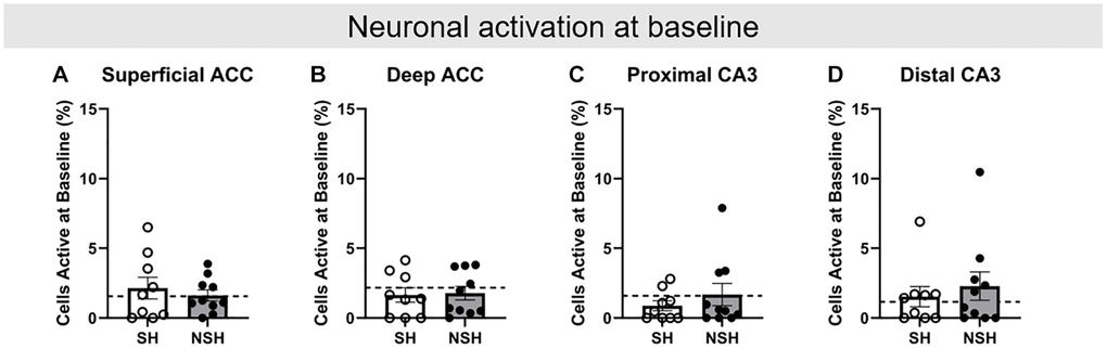 Analyses were performed to examine how the percent of neurons active in the aged rats during the behavioral tests (ALT and BAT) compare to the standard percent of neurons active in the non-enriched young adult rats, again using one-sample t-tests with the population average generated from the young rats. Importantly, no significant differences in baseline neuronal activation in any brain region for either SH or NSH rats were found compared to the population average (SH: superficial ACC t(8) = 0.761, p = 0.468, d = 0.254; deep ACC t(8) = −1.013, p = 0.341, d = −0.338; proximal CA3 t(8) = −2.007, p = 0.080, d = −0.669; distal CA3 t(8) = 0.517, p = 0.619, d = 0.172; NSH: superficial ACC t(9) = 0.173, p = 0.867, d = 0.055; deep ACC t(9) = −0.801, p = 0.444, d = −0.253; proximal CA3 t(9) = 0.115, p = 0.911, d = 0.036; distal CA3 t(9) = 1.106, p = 0.297, d = 0.350, Figure 4).