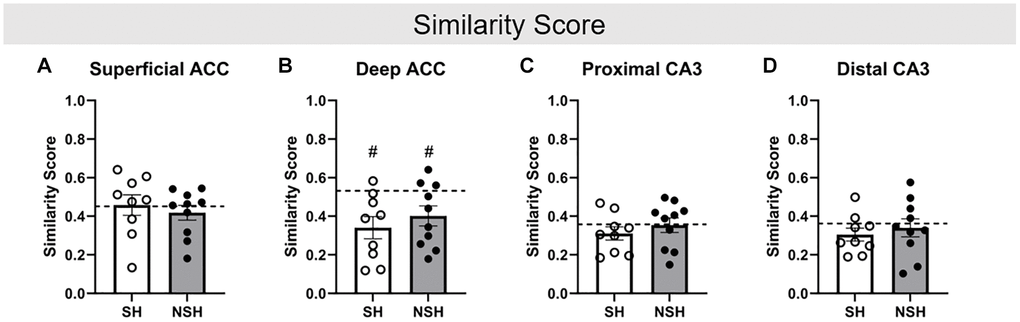 Finally, analyses of similarity score revealed that both SH and NSH animals had a significantly lower similarity score for neurons in the deep ACC compared to the population (SH: t(8) = −3.243, p = 0.012, d = −1.081; NSH: t(9) = −2.522, p = 0.033, d = −0.797, Figure 6B), indicating that the aged animals had fewer of the same deep ACC neurons active during both ALT and BAT compared to the young animals. This finding is consistent with previous research demonstrating that aged rats have lower similarity scores compared to young rats and suggests that young rats may be able to recruit a similar population of deep ACC neurons to perform distinct but related behaviors while aged animals may be impaired in this ability [31]. However, no significant differences in similarity score were found for the superficial ACC (SH: t(8) = 0.279, p = 0.788, d = 0.093; NSH: t(9) = −0.877, p = 0.403, d = −0.277, Figure 6A), proximal CA3 (SH: t(8) = −1.343, p = 0.216, d = −0.448; NSH: t(9) = −0.130, p = 0.899, d = −0.041, Figure 6C), or distal CA3 (SH: t(8) = −1.681, p = 0.131, d = −0.560; NSH: t(9) = −0.558, p = 0.591, d = −0.176, Figure 6D). This lack of difference in similarity score between the young and aged animals in a subregion specific manner may be the result of all aged animals having received EE. Previous research has demonstrated that EE has positive effects on cognition in old age [39, 40, 42, 45, 49–51, 53, 54]. Therefore, the EE received by the aged animals but not the young animals may have largely preserved the ability of the aged animals to recruit a similar population of neurons for both ALT and BAT, like the young animals. Additionally, since similarity scores were not different between the SH and NSH rats, EE may play a greater role in preserving the recruitment of the same neurons for related tasks than social enrichment.