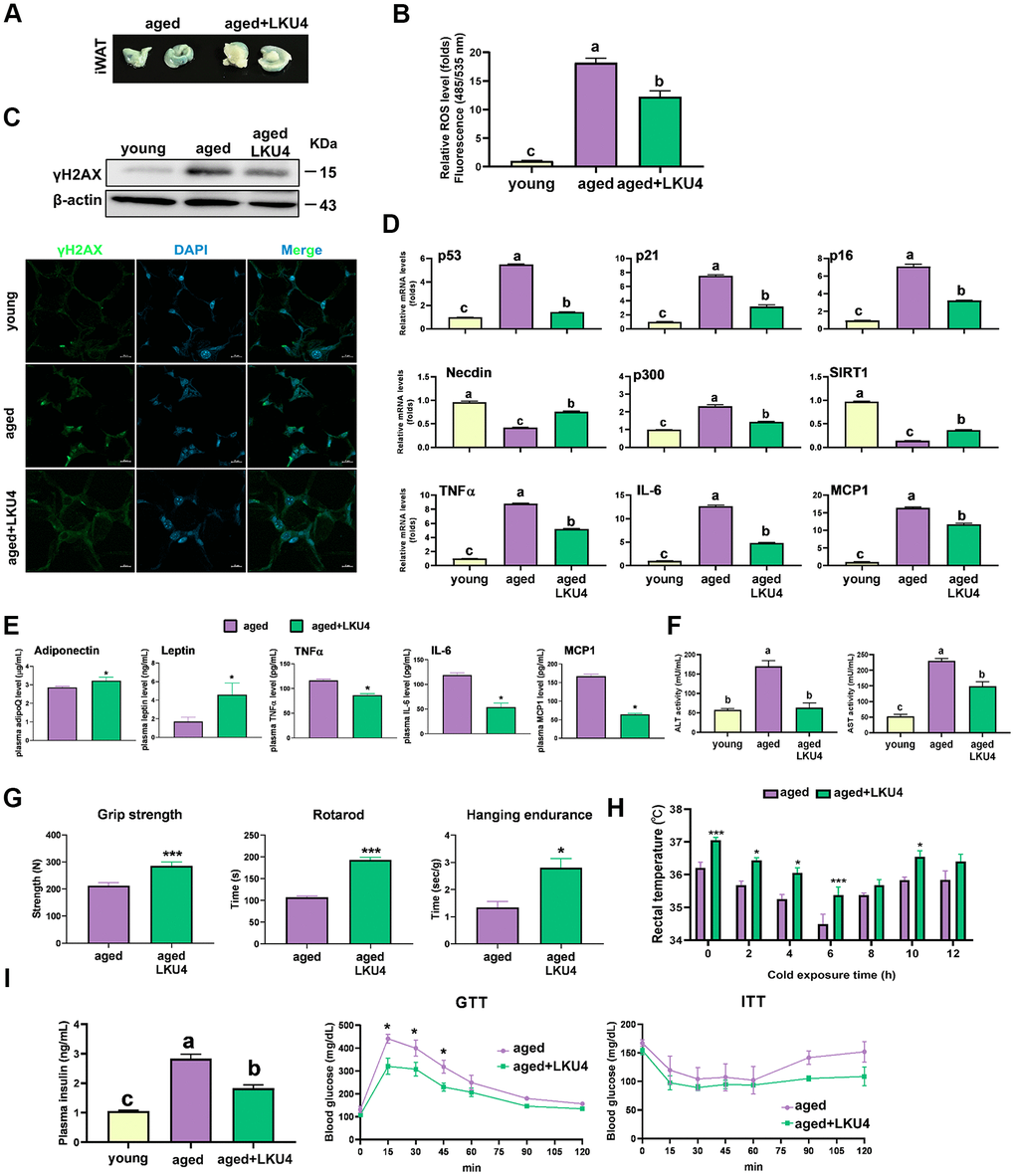 Notably, increased SASP production leads to chronic inflammation, contributing to age-related pathologies by impairing organ functions and systemic insulin sensitivity. Consistently, aged mice exhibited increased plasma levels of aspartate aminotransferase (AST) and alanine aminotransferase (ALT), liver damage markers, compared to young mice; meanwhile, LKU4 administration dramatically reduced these elevations (Figure 1F).