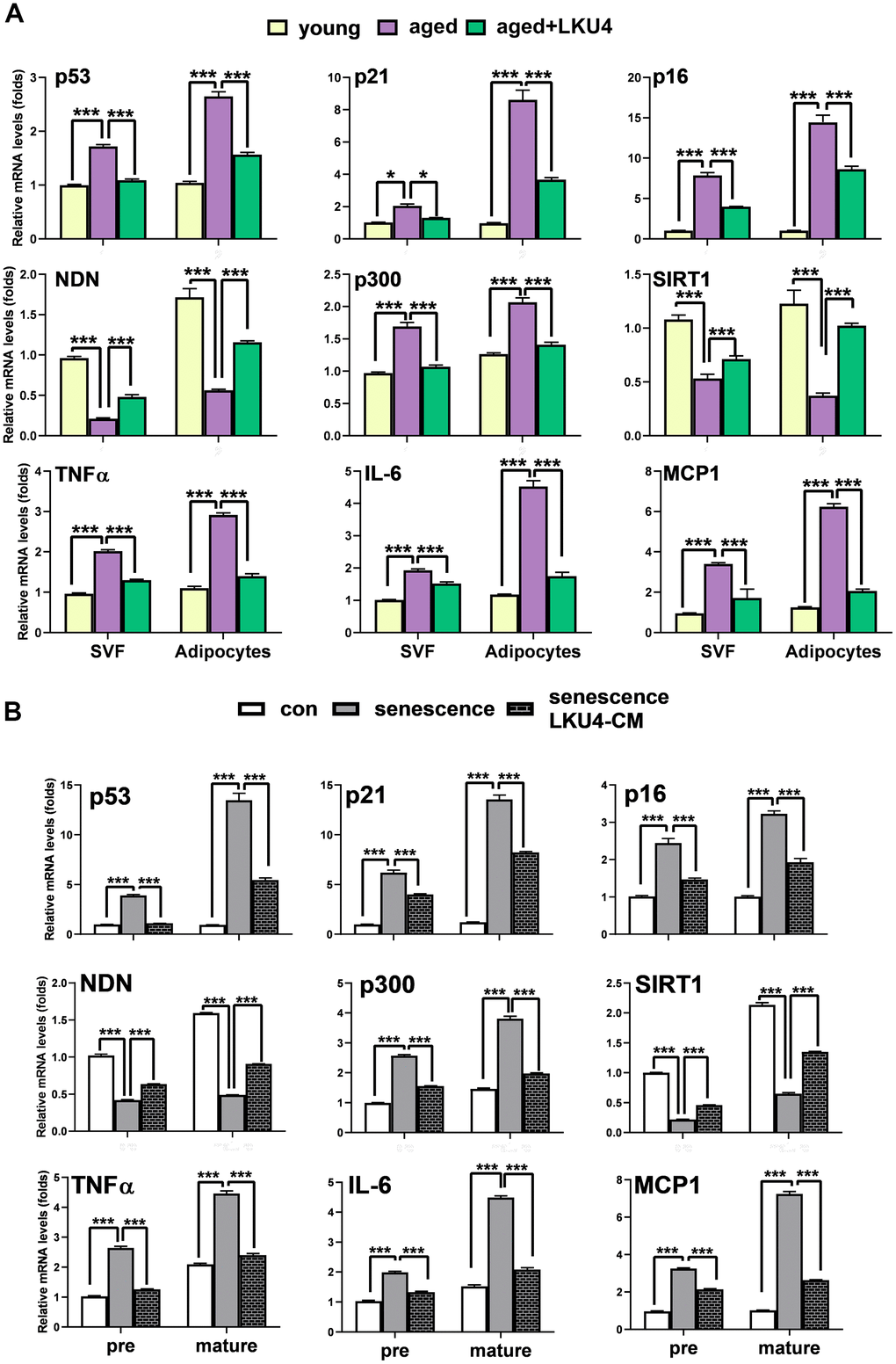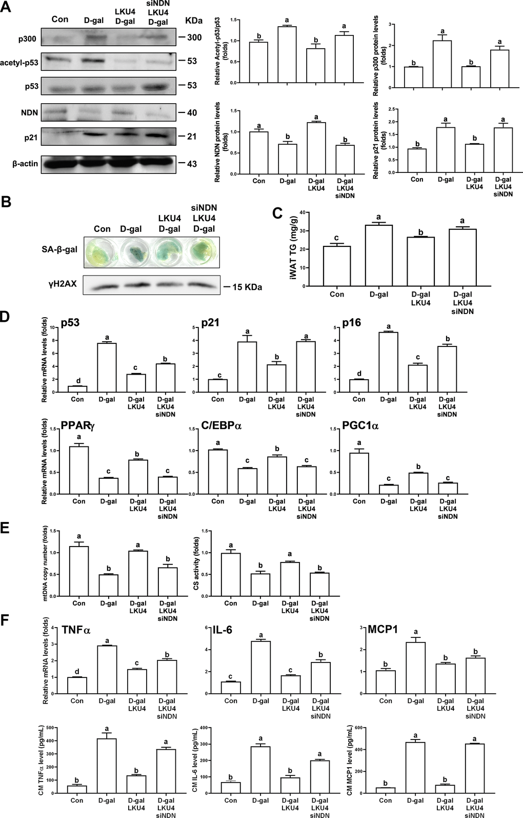 This study found that LKU4 administration attenuates adipocyte senescence in aged WAT by increasing the expression of NDN while downregulating p53 activity. Moreover, LKU4 reduced p300-induced acetylation of p53 in adipocytes under senescence conditions through NDN-mediated inhibition of the p53–p300 interaction, which occurs in a SIRT1-independent manner, consequently mitigating adipocyte senescence and SASP secretion. Our results demonstrate that LKU4 is critical for maintaining homeostasis in AT during aging, suggesting a potential application for LKU4 administration in age-related metabolic dysfunction.