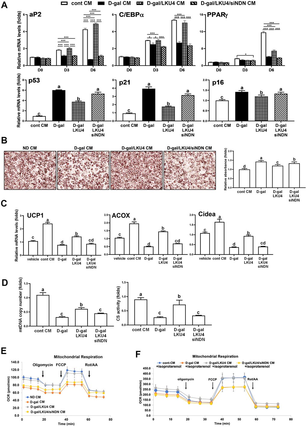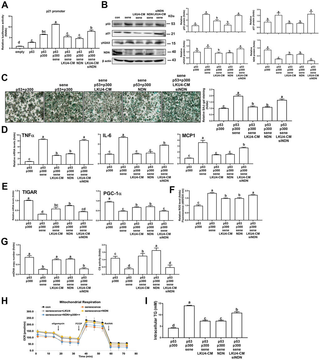 To determine the role of NDN in the LKU4-induced suppression of adipocyte senescence, we first performed a reporter gene assay in senescent HEK293T cells. Inducing senescence by administering 100 μM H2O2 for 24 h promoted p300 coactivation of p53 transcriptional activity by 1.7-fold, compared to vehicle treatment (Figure 4A). However, when LKU4–CM or NDN was added to these cells, the effect of H2O2 on p300-induced p53 activity was reduced by 52% and 60%, respectively. In contrast, when NDN-specific siRNA (siNDN) was added alongside LKU4–CM, the inhibitory effect of LKU4 on H2O2-induced p53/p300 activity was almost abolished. Consistent with this observation, WB analysis showed that H2O2 treatment of adipocytes differentiated from SVF cells increased γH2AX, p53, and p21 levels by ~1.3–3-fold compared to vehicle treatment, in parallel with reduced NDN expression. However, LKU4–CM treatment reversed these H2O2-induced changes (Figure 4B). NDN also reduced γH2AX, p53, and p21 levels by ~50–60% in senescent adipocytes. Moreover, the co-addition of siNDN and LKU4–CM strongly inhibited the effect of LKU4 on these protein levels in senescent adipocytes. Subsequently, we performed SA-β-gal staining in H2O2-treated senescent adipocytes overexpressing p53 and p300. Both LKU4–CM and NDN decreased SA-β-gal staining in these senescent adipocytes, compared to the control senescent adipocytes. In contrast, NDN knockdown alongside LKU4–CM treatment abolished this observed LKU4 effect on SA-β-gal staining (Figure 4C). Consistently, both LKU4–CM and NDN inhibited H2O2-induced expression of the SASP (TNFα, IL-6, and MCP1) in adipocytes overexpressing p53 and p300; meanwhile, this inhibitory effect of LKU4–CM was attenuated by NDN silencing (Figure 4D). Notably, p53 is frequently associated with mitochondrial function in stress conditions, and an alteration in mitochondrial function plays a crucial role in cellular senescence, including oxidative stress and SASP production. Consistently, H2O2-induced senescence in adipocytes overexpressing p53 and p300 promoted a 69% reduction in the mRNA levels of genes involved in mitochondrial function (TIGAR and PGC-1α) (Figure 4E). These genes are also known as p53-regulated genes. Both LKU4–CM and NDN partially restored the expression of these genes in senescent adipocytes, while NDN knockdown abolished this LKU4–CM-induced restoration. Concurrently, when H2O2 was administered to adipocytes transfected with p53 and p300, the cellular ROS levels were 1.8-fold higher than those following vehicle treatment; meanwhile, LKU4–CM and NDN alleviated the H2O2 effect on the ROS levels in these cells by 12% and 14%, respectively (Figure 4F). However, when siNDN was introduced, the inhibitory effect of LKU4–CM on ROS generation was significantly reversed. In addition, H2O2-induced cellular senescence promoted a 70% and 65% reduction in mtDNA copy number and CS activity, respectively, in 3T3-L1 adipocytes overexpressing p53 and p300, compared to vehicle treatment (Figure 4G). However, these reductions were restored by both LKU4–CM and NDN treatments, whereas NDN knockdown in LKU4–CM-treated adipocytes abolished these observed LKU4-CM-mediated effects. Senescent cells are known to exhibit decreased ATP production with lower OCRs. In line with these observations, lower basal and maximal OCRs were observed in senescent 3T3-L1 adipocytes overexpressing p53 and p300. In contrast, both LKU4–CM and NDN treatments enhanced the basal and maximal OCRs in these senescent 3T3-L1 adipocytes (Figure 4H). Interestingly, increased p300 expression suppressed the basal and maximal OCRs, even in the presence of NDN. This decline in mitochondrial metabolism during aging is closely associated with decreased triglyceride (TG) utilization, thereby promoting excessive TG accumulation in the AT. Likewise, H2O2-treated senescent 3T3-L1 adipocytes overexpressing p53 and p300 exhibited 3.3-fold higher intracellular TG levels than untreated control 3T3-L1 adipocytes; meanwhile, both LKU4–CM and NDN reduced senescence-induced intracellular TG levels by 48% (Figure 4I). However, the senescence effect on intracellular TG levels was partially recovered when NDN was silenced alongside LKU4–CM treatment. These results indicate that the NDN-mediated regulation of the p53–p300 pathway is critical for attenuating senescence and restoring senescence-associated adipocyte dysfunctions.