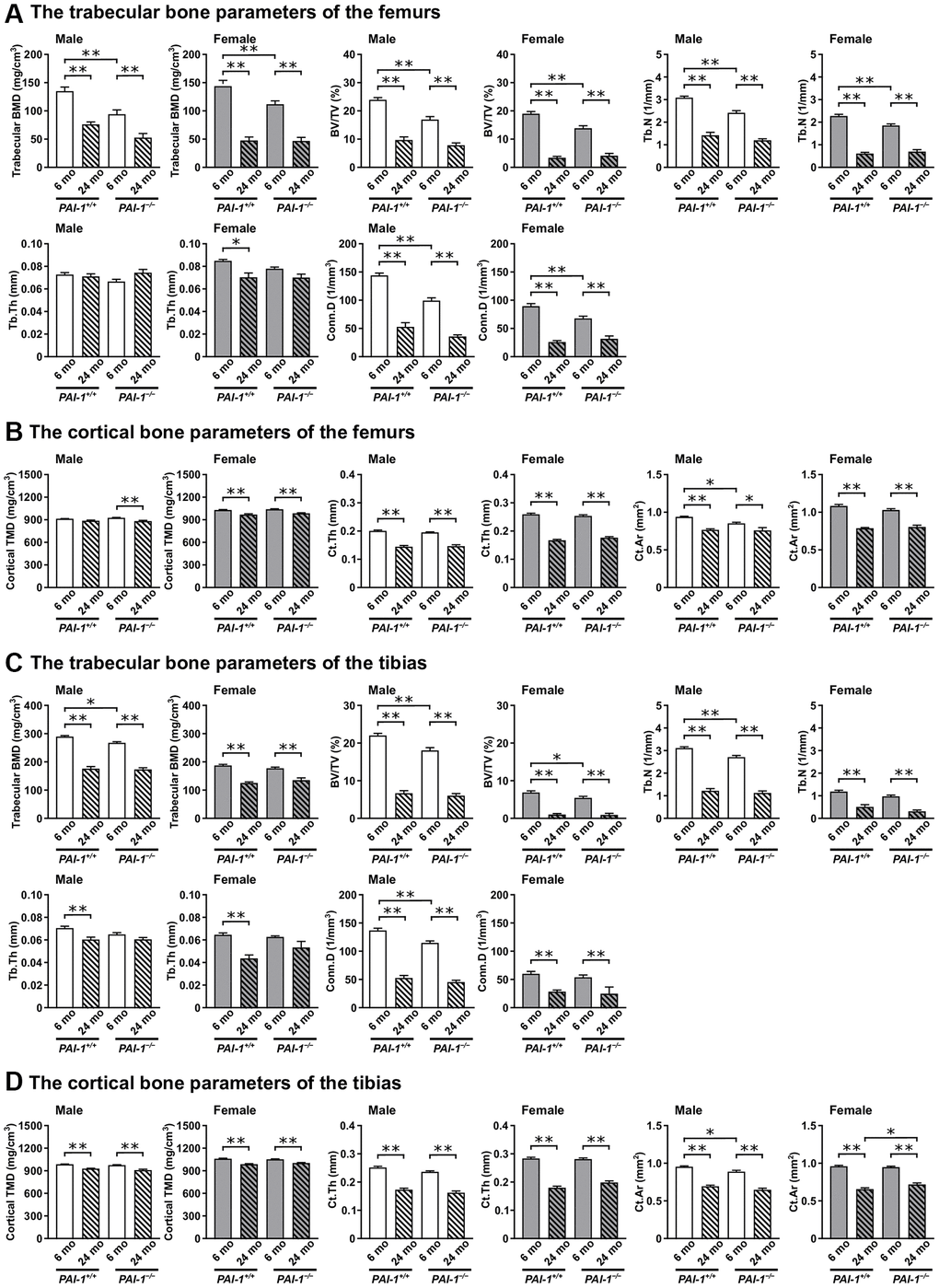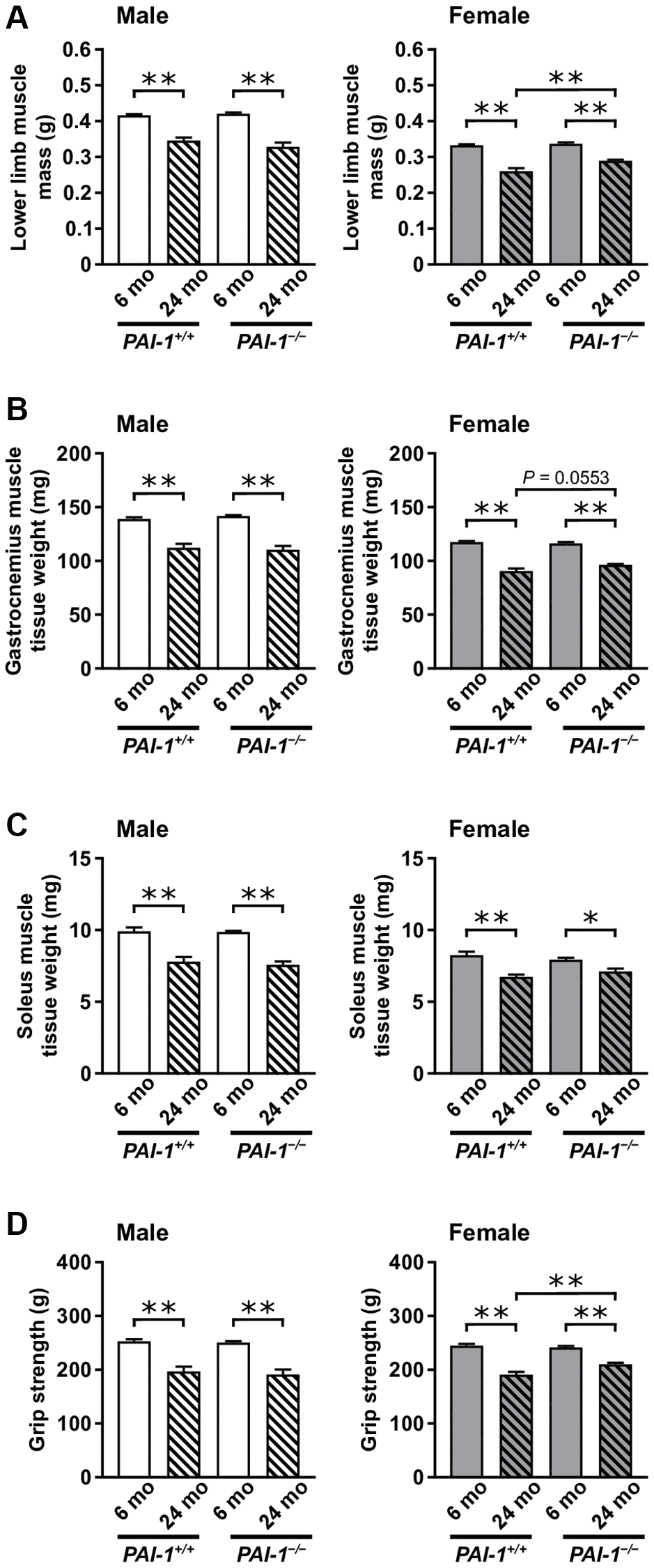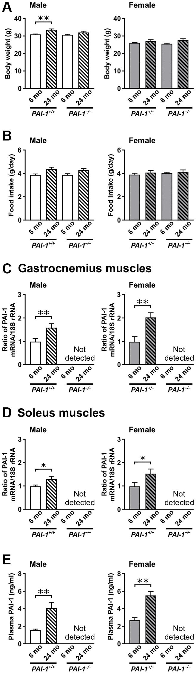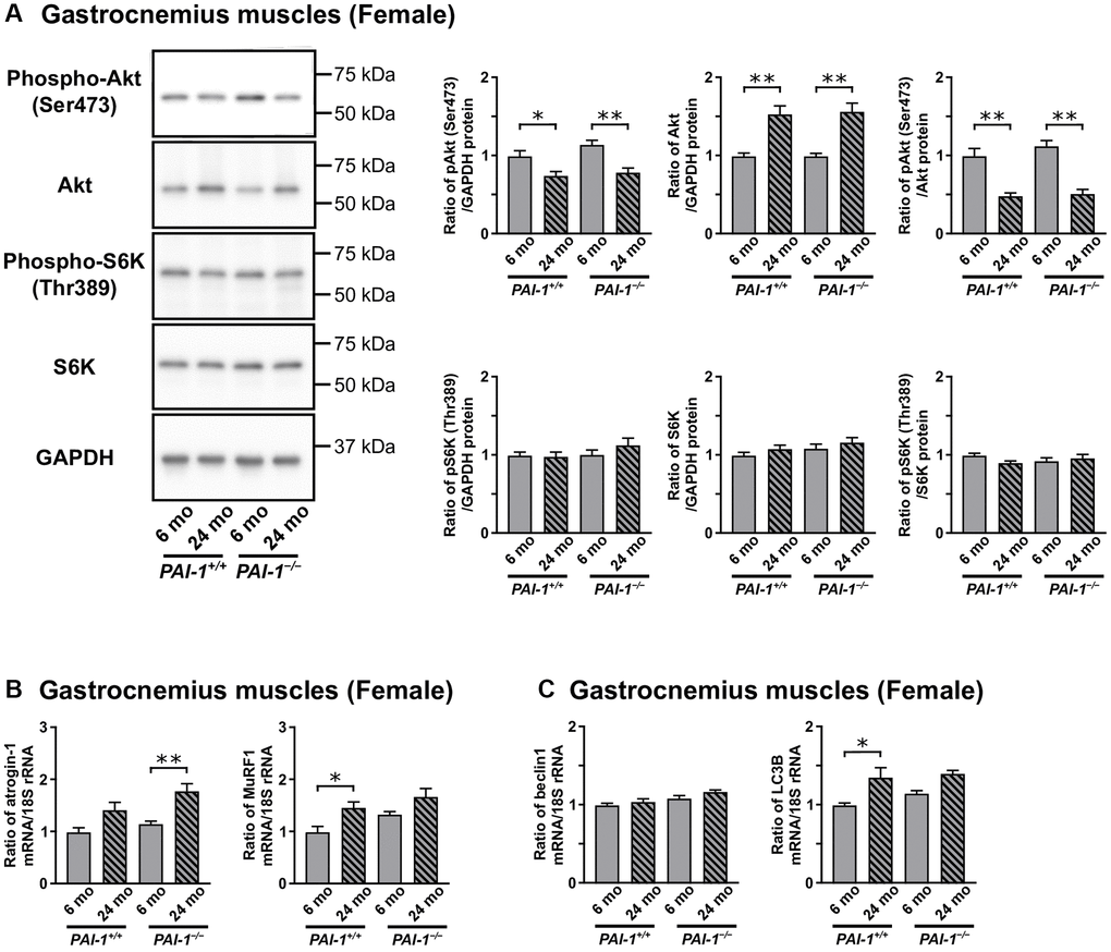 The present study therefore examined the involvement of PAI-1 in aging-related sarcopenia and osteopenia using female and male PAI-1 gene-deficient (PAI-1−/−) and wild-type (PAI-1+/+) mice. We considered 6- and 24-month-old mice as young and old mice, respectively, and compared the aging-related phenotypes in the fast-twitch gastrocnemius and slow-twitch soleus muscles or femurs and tibias.