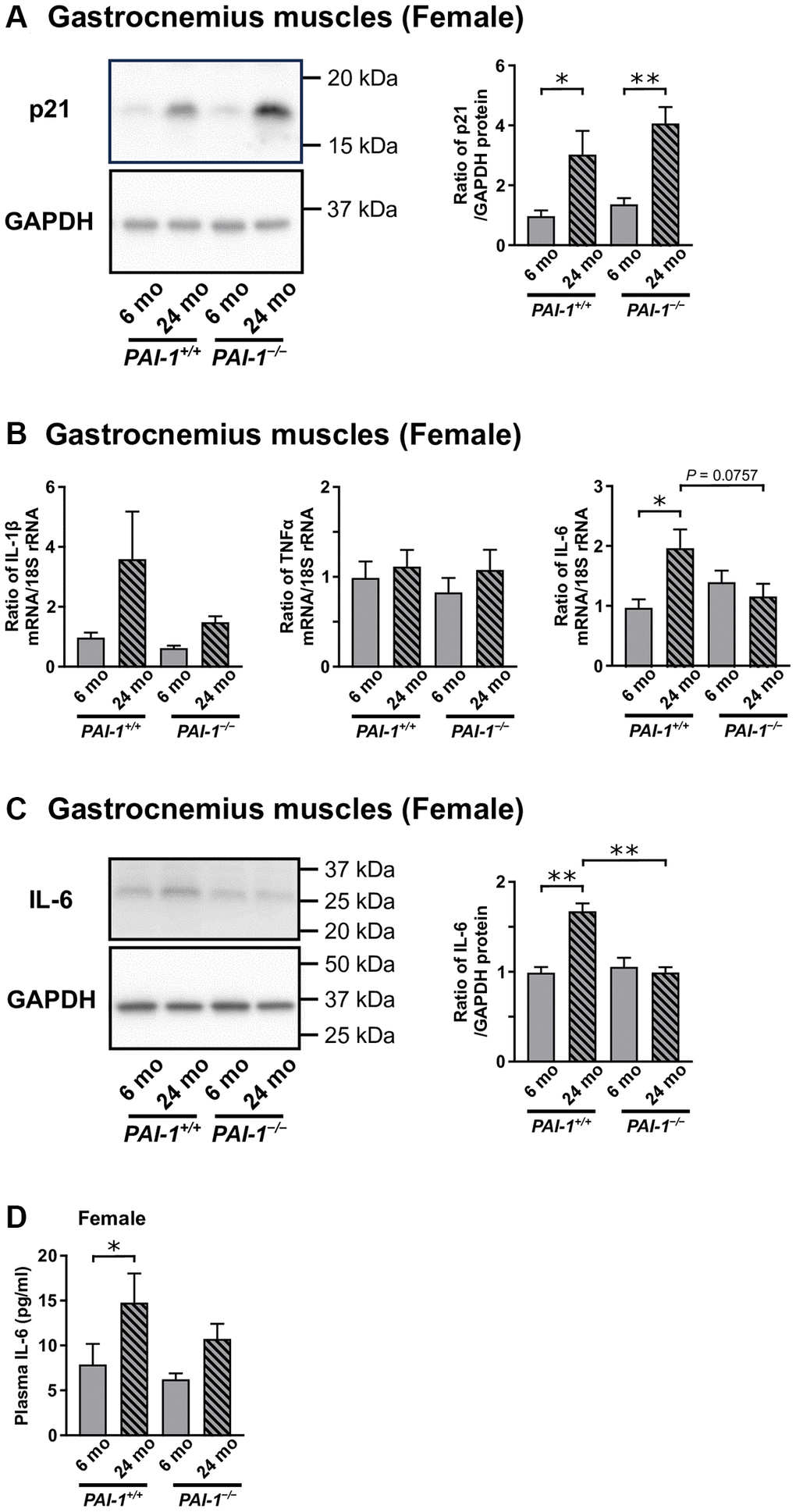 Aging significantly increased p21 expression in the gastrocnemius muscles of female mice, regardless of PAI-1 deficiency (Figure 6A). We then examined the gene expression levels of SASP markers, IL-1β, TNFα, and IL-6 [8–10], in the gastrocnemius muscles of female mice (Figure 6B). Accordingly, aging significantly increased the mRNA levels of IL-6 but not IL-1β or TNFα in the gastrocnemius muscles of female PAI-1+/+ mice. PAI-1 deficiency tended to blunt the aging-related increase in IL-6 mRNA levels, with no significant difference between 24-month-old female PAI-1+/+ and PAI-1−/− mice (P = 0.0757, Figure 6B). IL-6 protein levels increased significantly with aging in the gastrocnemius muscles of female PAI-1+/+ mice, whereas the aging-related increase in IL-6 protein levels was significantly suppressed in the muscles of 24-month-old female PAI-1−/− mice (Figure 6C). Similarly, plasma IL-6 levels increased significantly with aging in female PAI-1+/+ mice (Figure 6D). PAI-1 deficiency tended to reduce the aging-related increase in plasma IL-6 levels in female mice, whereas no significant difference in plasma IL-6 levels was observed between female PAI-1+/+ and PAI-1−/− mice at 24 months of age (Figure 6D).