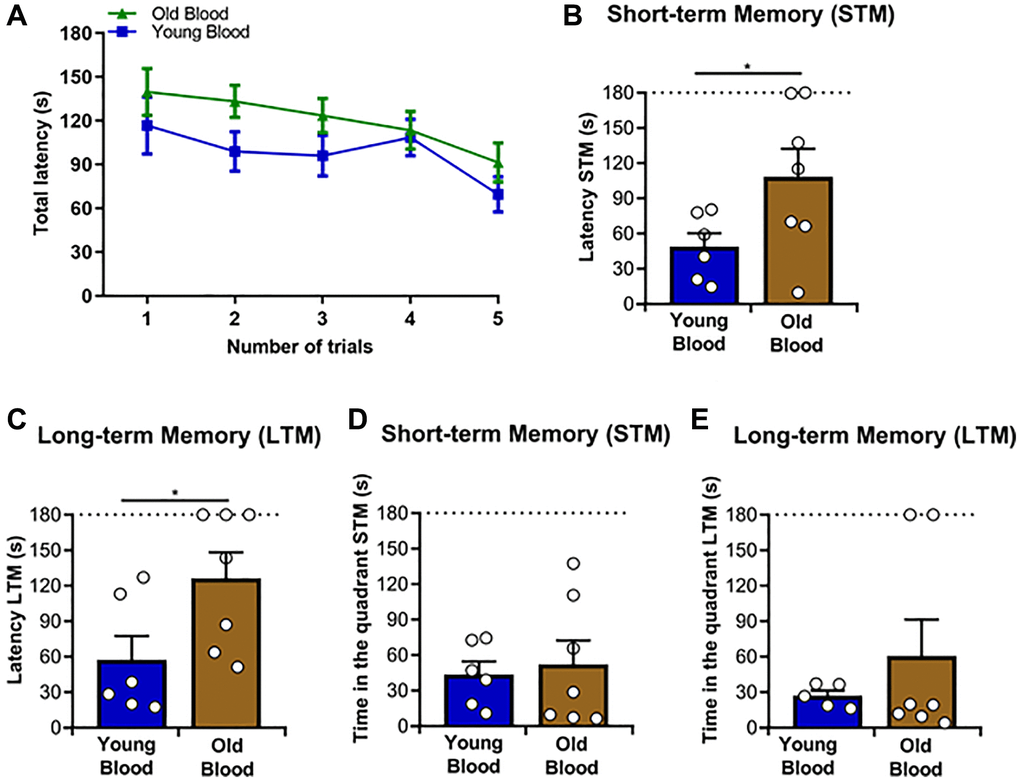 Multiple reports described that the administration of old blood components can transfer aging associated traits to younger individuals [28, 42, 44, 45]. On the contrary, the infusion of young blood is reported to provide beneficial effects over multiple deleterious phenotypes associated with aging [46, 47]. Considering that aging is the main risk factor of AD [48, 49], the effect of aged or young blood has been separately investigated in the context of this neurological disorder [50, 51]. Here, we aimed to study, in parallel, the effects that infusion of blood from old or young donors exerted in an animal model of brain amyloidosis. Specifically, we used Tg2576 mice [52] for these experiments. Male and female Tg2576 mice received blood infusions from either old or young wild-type animals from the same genetic background as described in the Materials and Methods section. Briefly, Tg2576 mice received 30 blood infusions at weekly intervals and sacrificed at 12 months of age. Then, their brains were studied for multiple disease-associated parameters including histopathological, biochemical, and proteomic evaluations (Figure 1). Before sacrificing, treated mice were tested for spatial memory using the Barnes maze paradigm [38]. Mice subjected to this test showed similar learning curves without significant differences between the groups treated with young or old blood (Figure 2A). Then, parameters for short-term memory (STM) and long-term memory (LTM) were measured. These analyses showed significant differences in latency for STM and LTM (Figure 2B, 2C). These results indicate that mice treated with old blood display more difficulties remembering where the escape chamber was located compared to subjects treated with blood from young wild type mice. The time mice spent in the target quadrant was also measured. There, no significant differences were registered when the test was conducted at 5 (STM) or 12 (LTM) days after starting training (Figure 2D, 2E). Overall, this information shows that blood from old or young donors modulate spatial memory when administered into a mouse model of AD.