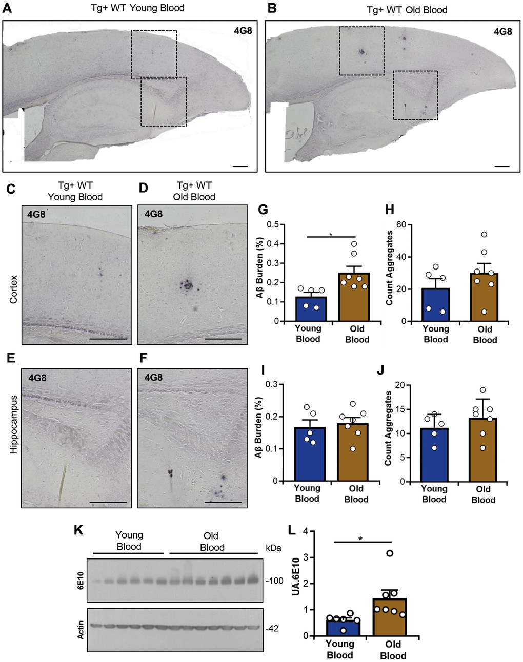 We additionally analyzed whether blood infusion altered other elements of the amyloid cascade. Specifically, we questioned whether the production of the amyloid-β precursor protein (APP) is affected by blood treatments. APP levels in the brain of mice treated with blood from both young and old wild-type donors were evaluated via western blotting using the 6E10 antibody. Interestingly, APP levels differed significantly between both treatment groups, with a notable increase in Tg2576 mice receiving old blood compared to mice who received young blood (Figure 3K, 3L). Overall, our data suggest that the infusion of blood from donors of different ages alters the deposition of Aβ in the brain of Tg2576 mice in a region-specific manner. These changes seem to be translated in the degree of compactness of the aggregates and could be related with the differential expression of APP in this particular transgenic model.