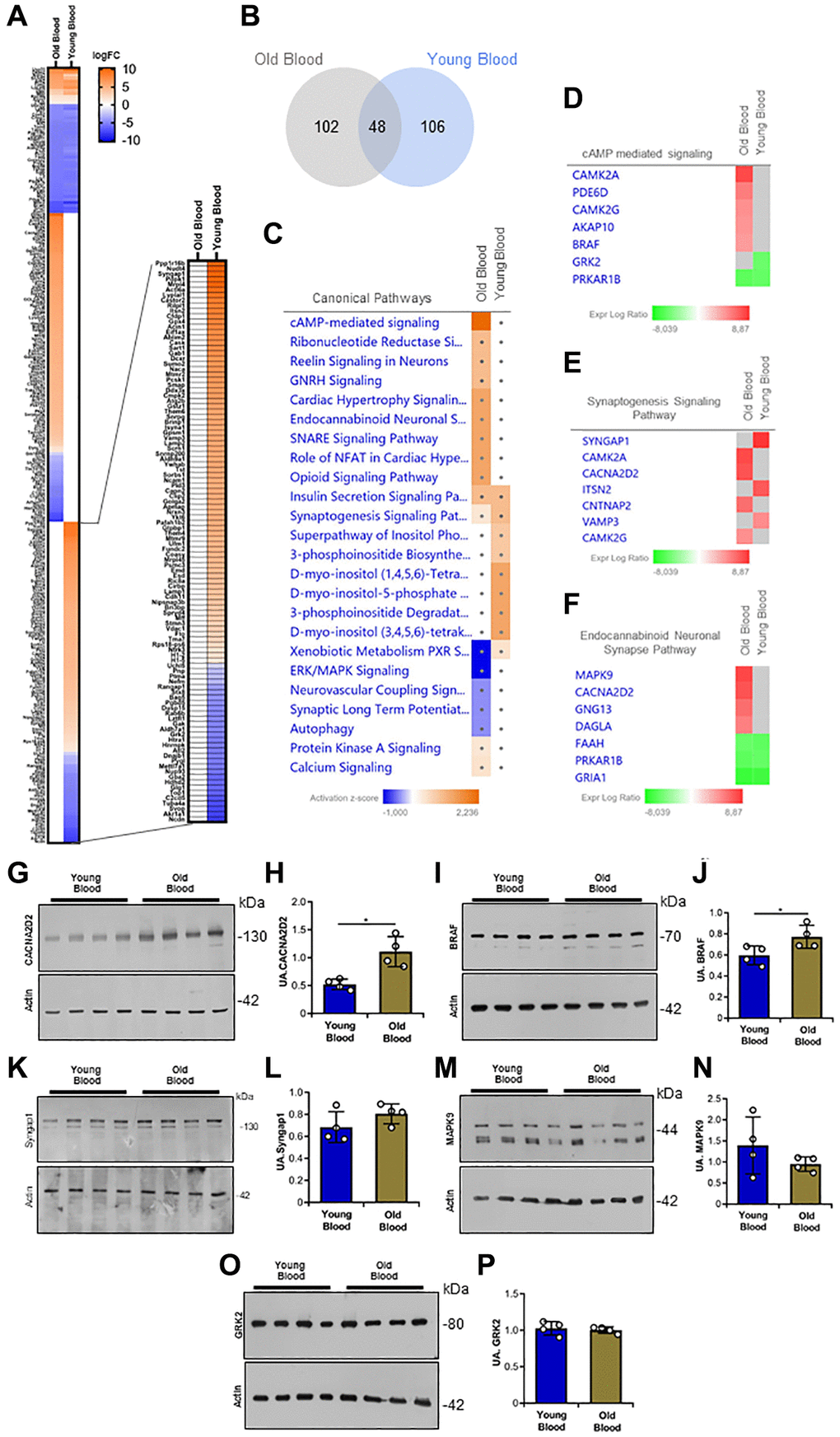 Brain homogenates from Tg2576 mice infused with young or old blood were used for western blotting analyses. While SYNGAP1, MAPK9 and GRK2 protein levels showed no significant differences between the two experimental conditions, the CACNA2D2 and BRAF protein levels were found to be increased in the brains of Tg2576 mice injected with old blood compared to Tg2576 mice injected with young blood (Figure 4G–4P). These data suggest that young and old blood infusion differentially affect synaptic plasticity and neuronal homeostasis, as well as the regulation and influx of cellular calcium ions in Tg2576 mice.