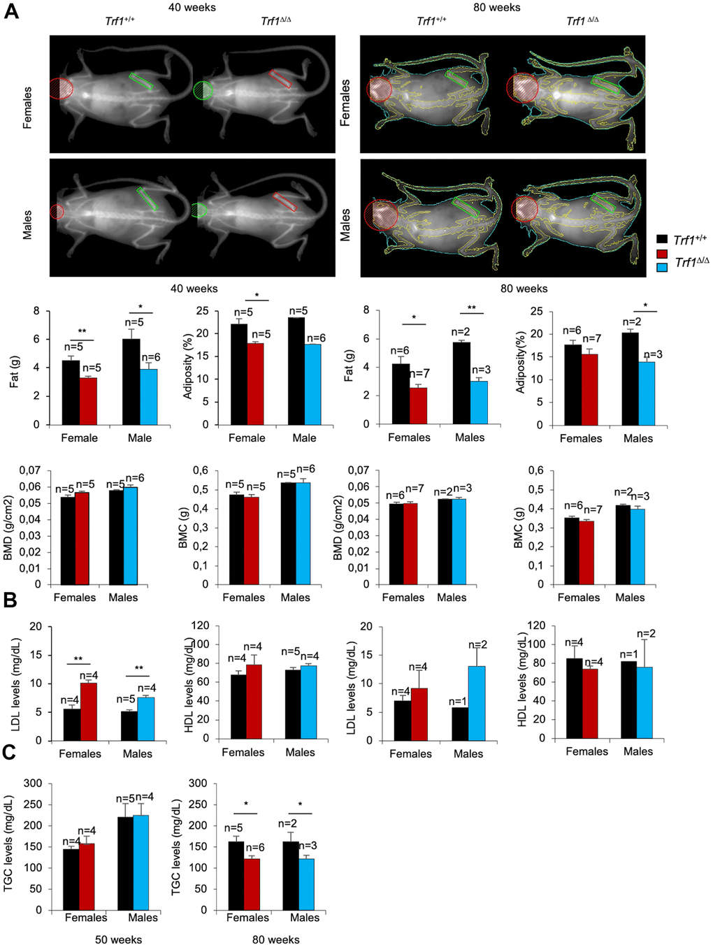 This trend persisted at 80 weeks of age; however, differences in both LDL and HDL levels did not reach statistical significance (Figure 2B). Plasma triglycerides levels were similar in 50 weeks old Trf1Δ/Δ and wild-type mice but were significantly decreased at 80 weeks of age in Trf1Δ/Δ mice of both genders (Figure 2C). None of the other metabolic and blood chemistry parameters tested showed significant differences between genotypes (Supplementary Figure 1D). Altogether, these findings indicate that Trf1 deletion induced a persistent weight reduction due to decrease adiposity.