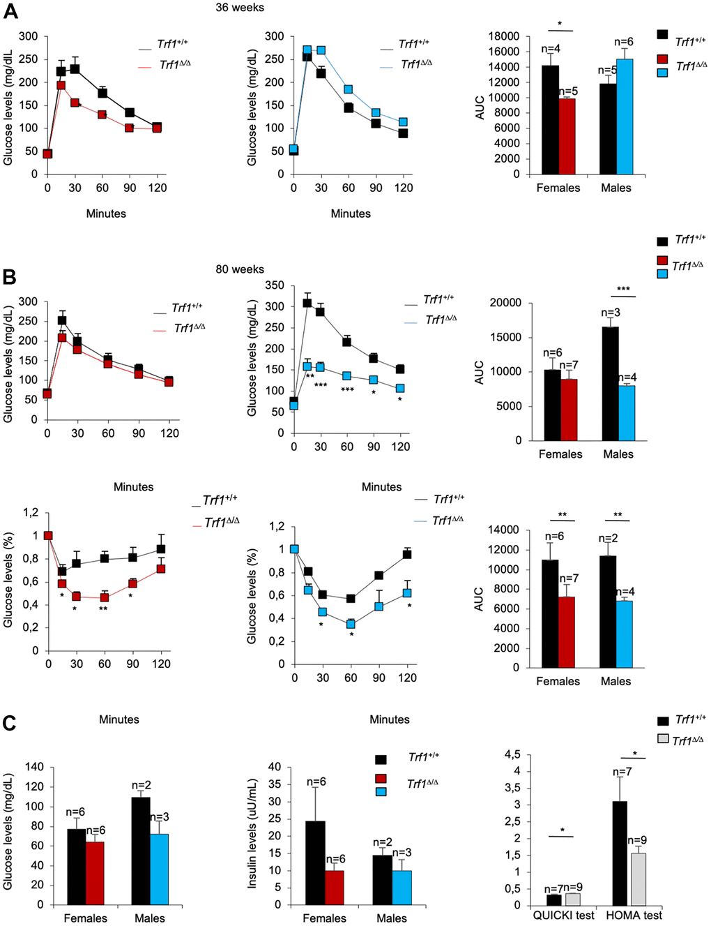 Given the unprecedented effect of Trf1 deletion on reducing fat content and body weight, we next set to address whether Trf1 abrogation affected other major metabolic parameters, such as glucose and insulin metabolism. At thirty-six weeks of age, Trf1Δ/Δ mice showed improved glucose tolerance compared to wild-type controls, reaching statistical significance in the case of females (Figure 3A). In turn, at eighty weeks of age, Trf1Δ/Δ males showed better glucose tolerance compared to wild-type controls. Accordingly, both Trf1Δ/Δ male and female mice showed an improved tolerance to insulin at eighty weeks of age compared to wild-type mice (Figure 3B). Of note, upon fasting, however, we found similar glucose and insulin levels in both genders at eighty weeks of age. The derived insulin resistance and insulin sensitivity indices, homeostatic model assessment (HOMA-IR), and quantitative insulin sensitivity check index (QUICKI), respectively, revealed improved insulin resistance and increased insulin sensitivity in Trf1 deleted mice of both genders at eighty weeks of age (Figure 3C). In summary, Trf1Δ/Δ mice exhibit an enhanced glucose metabolism with aging.