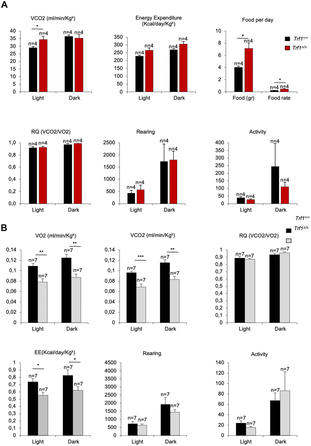 We next determined whether decreased body weight and improved lipid, glucose and insulin metabolism in Trf1Δ/Δ mice could be attributed to a lower food intake or to an increase physical activity as the consequence of TRF1 protein abrogation. To this end, we subjected forty-three weeks old females to metabolic cages. Due to the limited space, we could not study male mice. We found that Trf1-deficient females produce more volume of dioxide (VCO2) and tend to use more energy compared to wild-type females during light cycles. The production of more volume of CO2 and the use of more energy indicates an increase metabolic rate of females without Trf1 compared to wild-type controls (Figure 4A). Of interest, in spite of their lower weight, Trf1Δ/Δ mice showed a higher food intake, indicating that the lower body weight is not the consequence of a lower food intake (Figure 4A). We did not find any differences between genotypes in the respiratory quotient (RQ), activity, and rearing (Figure 4A). At eighty-two weeks of age, we found significantly lower levels of VCO2, volume of oxygen (VO2), and energy consumed in Trf1Δ/Δ mice of both genders compared to wild-types controls (Figure 4B). At this age, no differences between genotypes were observed in activity, rearing and respiratory quotient (Figure 4B). In summary, the leanness observed in Trf1Δ/Δ mice cannot be attributed to reduced food intake or increased physical activity levels. Interestingly, in forty-three weeks old females, the absence of TRF1 leads to heightened metabolic activity as evidenced by increased production of CO2 volume, higher energy consumption, and elevated food intake compared to wild-type controls.