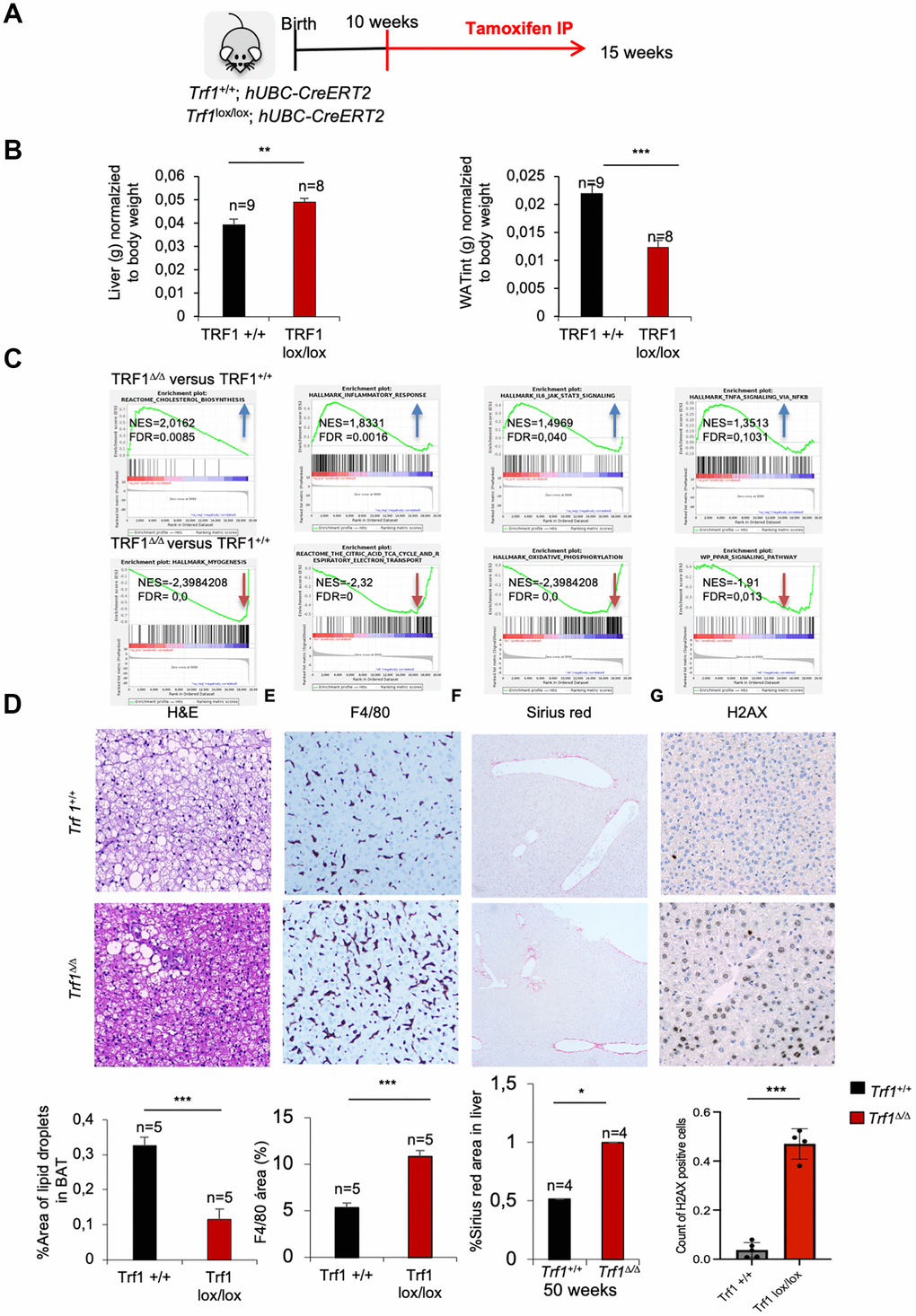 In summary, young Trf1-deficient females displayed a higher liver weight, which was concomitant with an upregulation in pathways related to cholesterol biosynthesis and inflammation. We also found a downregulation on myogenesis pathways concomitant with increased DNA damage liver damage and fibrosis as determined by H2AX and Sirius red staining’s respectively. Major metabolic pathways related with energy production and regulation of metabolism homeostasis were also found downregulated in Trf1-deficient mice. In addition, white adipose tissue of Trf1Δ/Δ mice weight less compared to wild-types.