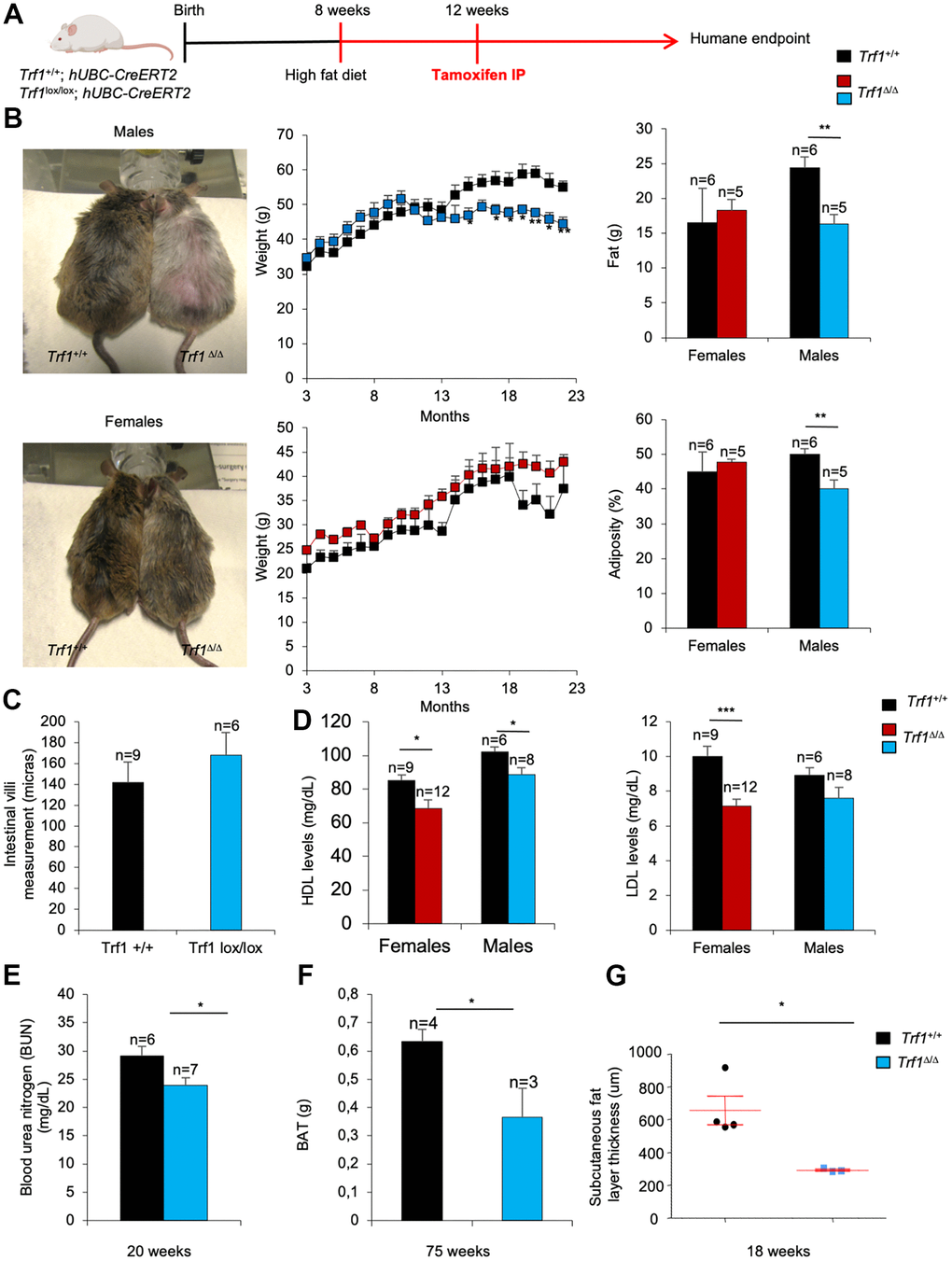 Next, we addressed the impact of a high-fat diet in the metabolic phenotypes found in TRF1-abrogated mice. Under a high-fat diet, Trf1Δ/Δ males showed a significant lower body weight, lower total fat content, and lower adiposity compared to wild-type male controls, while this was not observed in female counterparts (Figure 6A). Again, the decreased body weight in males subjected to a high fat diet was not associated to intestinal atrophy as the consequence of TRF1 abrogation as indicated by similar length of the intestinal villi in Trf1Δ/Δ and wild-type males (Figure 6B).