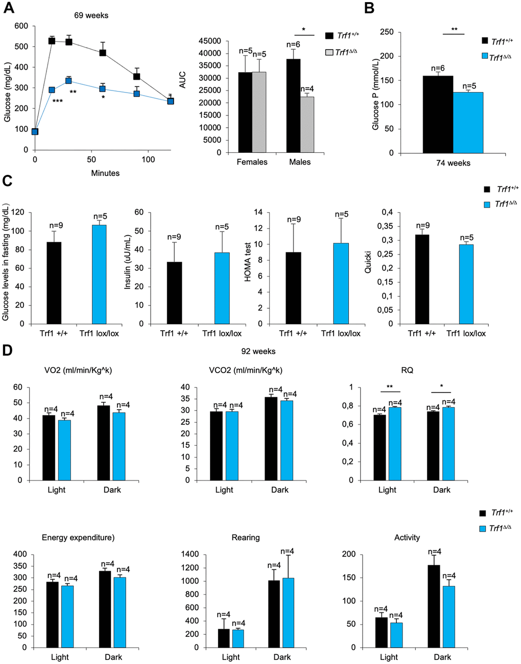To further study the male phenotype, we studied glucose and insulin metabolism. Plasma glucose P levels were strikingly lower in Trf1 deleted mice compared to wild-type males (Figure 7B). When mice were subjected to fasting, glucose and insulin levels were similar between genotypes. In accordance with mice fed with high-fat diet, both genotypes showed resistance to insulin (Figure 7C). Next, we measured the Respiratory Quotient (RQ) in both genotypes by using metabolic cages. An RQ between 0.7 and 1 indicates that the sources of energy are protein and fat. In high-fat fed mice, the expect RQ should be under 0.7, as fat is the main source of energy. As expected, wild-type males showed an RQ below 0.7 (Figure 7D). In contrast, the RQ in Trf1-deficient mice was close to 0.7 (Figure 7D), suggesting that they use protein and fat as energy sources. No differences were observed in VO2, VCO2, energy expenditure, rearing and activity (Figure 7D). Food intake could not be determined as the mice were gnawing the food.