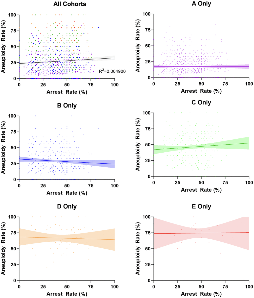 The Pearson correlation coefficient between aneuploidy and arrest rates was calculated for each age group and for all cohorts combined. R2 thresholds of <0.1, 0.1–0.3, 0.3–0.5, and >0.5 were used to define no correlation, low degree of correlation, moderate degree, and high degree, respectively.