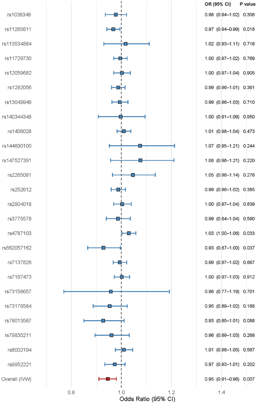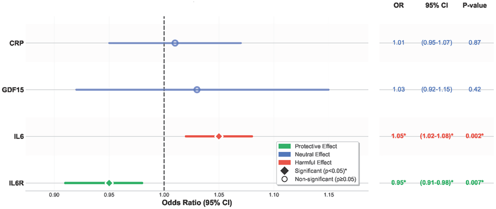 Genetically proxied higher IL6R levels were significantly associated with a lower risk of all-cause mortality (OR = 0.95; 95% CI: 0.91–0.98; P = 0.007; Figure 1), as well as with a reduced risk of major cardiovascular outcomes. These findings were derived from a Mendelian randomization analysis using genome-wide significant variants robustly associated with circulating IL6R levels.