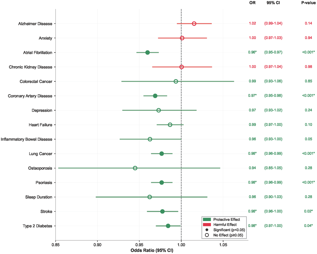 Consistent protective effects were also observed for specific cardiovascular outcomes, including atrial fibrillation (OR = 0.96; 95% CI: 0.95–0.97; P < 0.001), coronary artery disease (OR = 0.97; 95% CI: 0.95–0.98; P < 0.001), and stroke (OR = 0.98; 95% CI: 0.97–1.0; P = 0.045) (Figure 2).