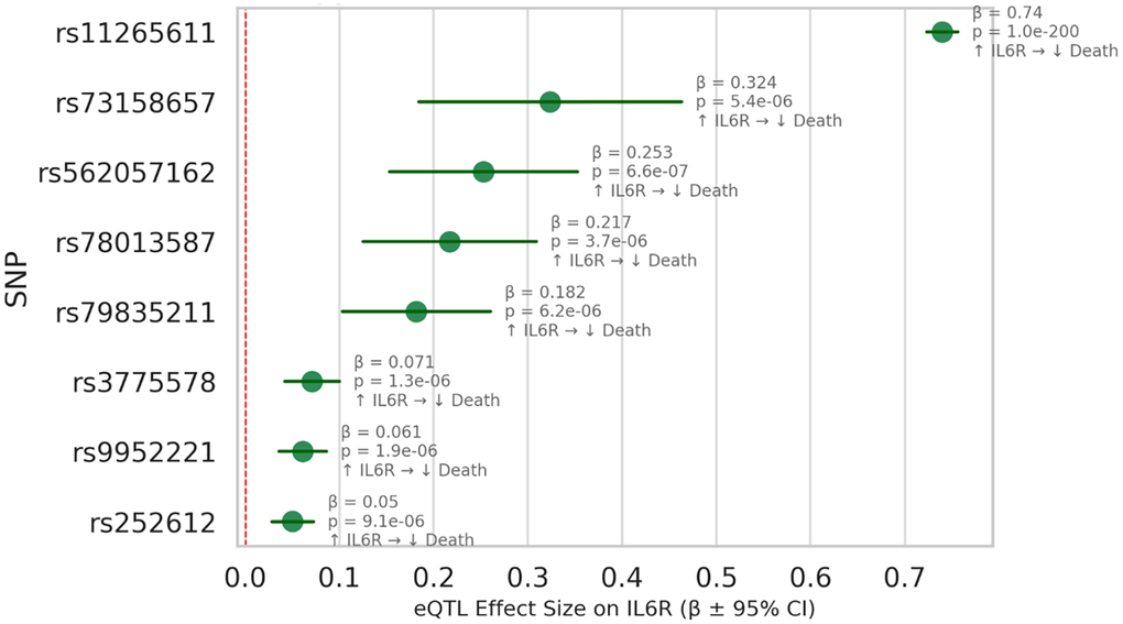 eQTL analysis confirmed the biological relevance of our genetic instruments through their effects on target gene expression (Figure 4). Selected IL6R variants showed significant negative eQTL effects, indicating reduced IL6R gene expression, in line with their protective association with mortality.