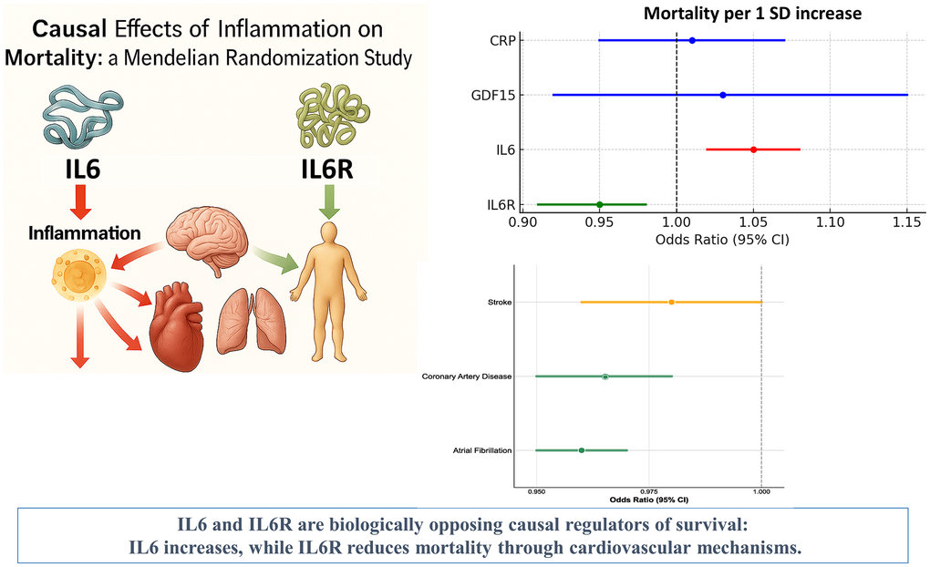 Chronic low-grade inflammation is currently recognized as a core driver of cardiovascular disease and mortality [1–3]. Additionally, acute inflammatory episodes contribute to mortality risk through distinct but overlapping pathways, including sepsis, cytokine storm syndromes, and acute cardiovascular events [4]. Elevated circulating markers such as interleukin-6 (IL6), C-reactive protein (CRP) and growth differentiation factor-15 (GDF15) track with higher risks of cardiovascular disease, diabetes, cancer and neurodegeneration, yet their causal role remains uncertain because observational data are prone to confounding and reverse causation [5].