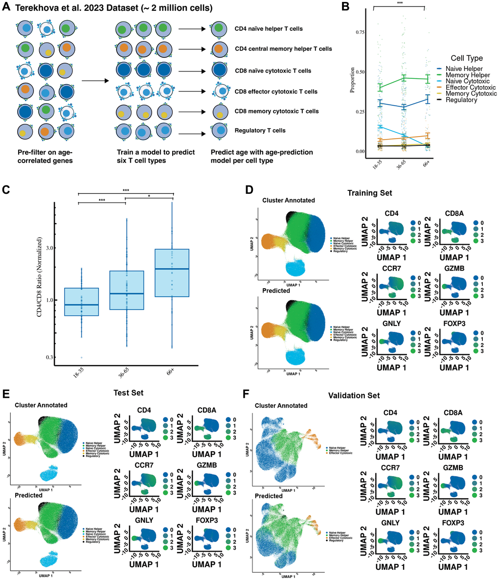 The Terekhova et al. (2023) dataset was used to train the cell type prediction and age prediction models. This dataset comprised roughly 2 million peripheral blood mononuclear cells from 317 samples from 166 individuals aged 25–85 years old. All participants were healthy Caucasian non-obese non-smokers. Blood was collected between 2018 and 2021 after an overnight fast. The Chromium Single Cell 5’ v2 Reagent Kit from 10x Genomics was used to generate single-cell transcripts. The Yasumizu et al. (2024) dataset was used to validate the accuracy of our cell type prediction and age prediction models and contained 1.8 million CD4+ T cells generated using the Chromium Next GEM Single Cell 5′ Kit v2.