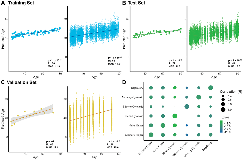 For the training set, we observe a strong correlation between the predicted age of a cell and chronological age (R = .56, mean absolute error (MAE) = 11.9, p < 1 × 10−16), particularly when the average age of all cells per donor is calculated (R = .84, MAE = 11.4, p < 1 × 10−16) (Figure 2A). As expected for a lineage-restricted aging clock, donor-level averaged predictions occupy a narrower age range than chronological age, reflecting shared transcriptional constraints within each T cell lineage rather than a limitation of model performance. Similarly, we observe a moderate correlation in the test set (R = .49, MAE = 13.5, p < 1 × 10−16), which also increases when we compute the average age of all cells per donor (R = .8, MAE = 11.5, p < 1 × 10−12) (Figure 2B). We apply Tictock to the Yasumizu et al. (2024) dataset and observe a weaker but still significant correlation on a cell level (R= .38, MAE = 15.2, p < 1 × 10−16), and when cells are averaged per each donor (R = .78, MAE = 6.5, p = .001) (Figure 2C). Because Tictock consists of six cell-type–specific clocks trained within individual T cell subsets, the donor-level predicted ages occupy a narrower absolute range than the full chronological span of the cohort. This reflects the restricted transcriptional variation that is available within a single immune lineage and is expected for lineage-specific single-cell models [28, 32]. In this context, the primary output of interest is the relationship between predicted and chronological age, particularly after averaging predictions at the donor level, rather than the absolute magnitude of the predicted values [11]. Consistent with this, age-differential calculations showed donor-level ranges of approximately −25 to +23 years in the Terekhova et al. training cohort, −28 to +19 years in the Terekhova et al. test cohort, −10 to +29 years in the Yasumizu et al. dataset, −21 to +37 years in Ren et al. (COVID-19), and −15 to +21 years in Wang et al. (HIV+ART).