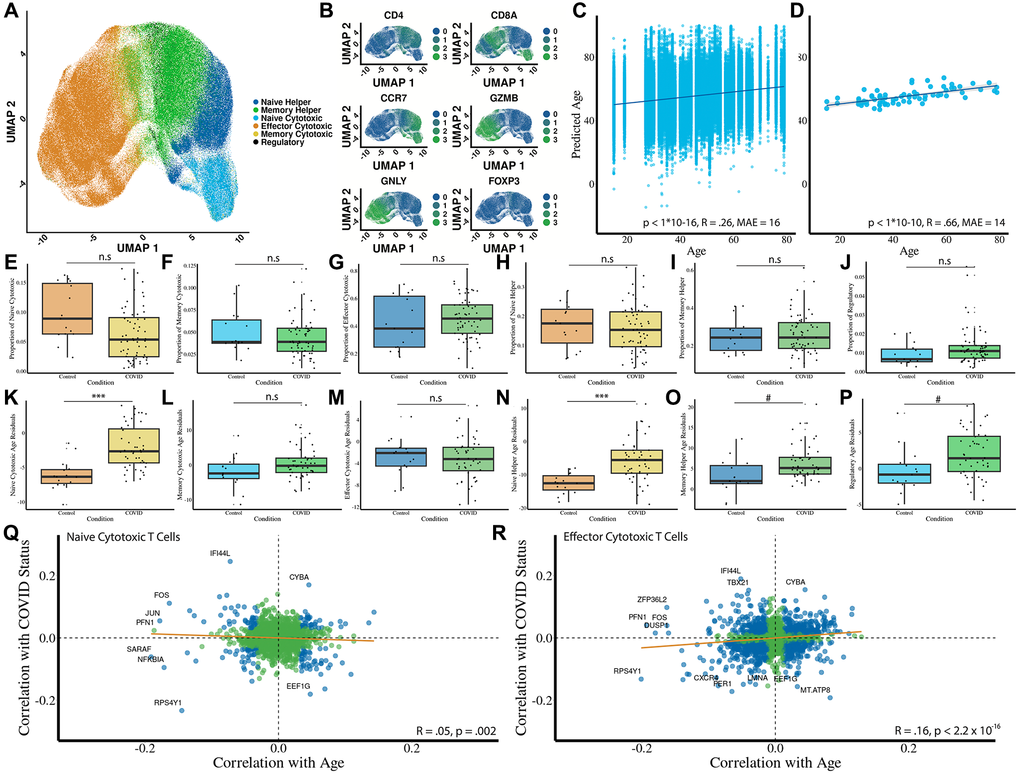 Next, we test whether predicted cellular ages are affected by COVID-19. Because COVID-19 donors were older than controls (Supplementary Figure 1), all disease-associated effects were evaluated using age residuals, which remove chronological age from the predicted transcriptomic age. We observe significant age acceleration in naïve CD8 (Figure 3K, p = 1e−6) and CD4 memory (Figure 3O, p = .02) cells. Naïve CD8 T cells showed substantial age acceleration in COVID-19 (mean age residual difference ≈ 3.6 years, 95% CI (2.1, 5.1), Cohen’s d ≈ 1.15), while memory CD4 T cells displayed a more moderate shift (mean difference ≈ 2.8 years, 95% CI (0.17, 5.41), Cohen’s d ≈ 0.63). In contrast, naïve CD4 helper cells do not show evidence of intrinsic age acceleration (Figure 3N, p = 1e−7) as their mean residual is slightly negative in COVID-19 donors. We did not see a significant shift in predicted age for CD8 memory (Figure 3L, p = .2), CD8 effector (Figure 3M, p = .98), or regulatory (Figure 3P, p = .07) T cells. Finally, we examine whether aging and COVID-19 share a transcriptional signature between aging and COVID-19 in naïve CD8 and effector CD8 cells. There is only a slight negative (Figure 3Q, R = −.05, p = .002) and a slight positive (Figure 3R, R = .16, p < 1 × 10−16) correlation between COVID-19 and aging in naïve CD8 and effector CD8 cells, respectively.