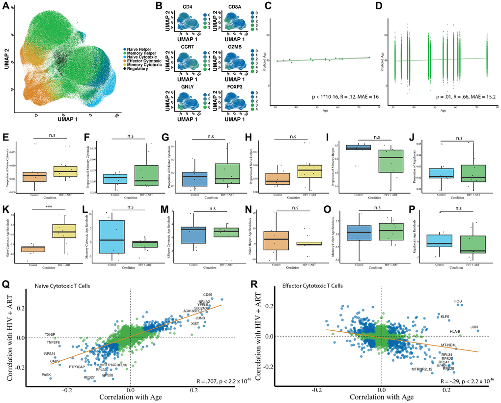 Similarly to the COVID dataset, we examine transcriptional signatures of HIV+ART relative to aging. In naïve CD8 cells (Figure 4Q), we observe a strikingly strong correspondence between genes that have a partial correlation with aging and those that have a partial correlation with HIV+ART (R = .7, p < 1 × 10−16). Interestingly, many of the genes most strongly correlated with both HIV+ART and aging have been previously characterized to be a signature of HIV, such as CD69 [40]. We also find a weaker negative correlation between genes associated with aging and HIV in CD8 effector cells (Figure 4R, R = −.29, p < 1 × 10−16).