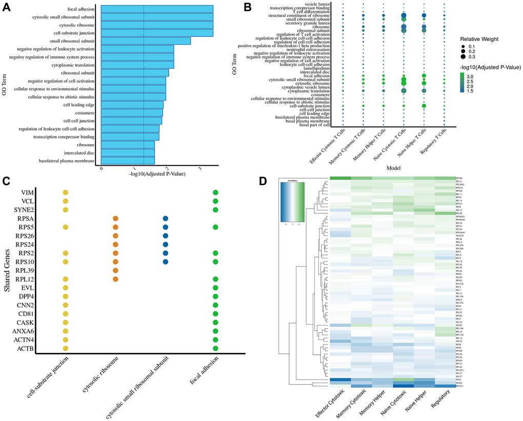 We focus on the subset of genes used by each age prediction model to conduct a broad exploratory analysis (Supplementary Figure 2). Accordingly, we perform a GO enrichment of the 209 shared genes across all six T cell age prediction models, revealing significant enrichment in ribosomal pathways, cell-substrate junction, focal adhesion, and cytosolic processes (Figure 5A). Mapping these shared predictive genes to their genomic locations revealed non-random clustering, with particularly dense regions on chromosomes 1 and 14 (Supplementary Figure 3). Next, we perform a deeper GO enrichment analysis of the individual T cell models. This is based on the total gene set specific to that individual model, weighting genes by their relative contribution (Figure 5B). This allows us to determine the functional significance of genes within each model (Supplementary Figure 4), highlighting that both naïve cytotoxic T cells and naïve helper T cells show particularly high involvement of ribosomal pathways.