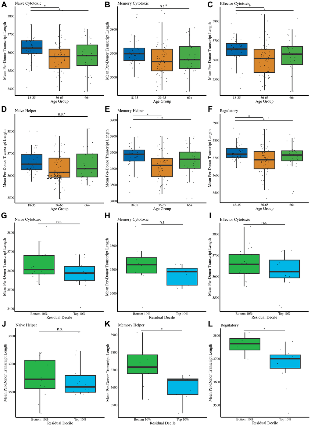 Due to increasing evidence that defective transcription of longer transcripts is associated with aging [42, 43], we sought to identify whether such defects could be identified in the immune system during human aging using our single-cell transcriptional biomarker. We find that older individuals had, on average, shorter transcript lengths in every T cell subset except for naïve CD4 T cells and memory CD8 T cells (Figure 6A–6F). To test whether shorter transcript lengths are associated with an accelerated predicted age, we estimate transcript lengths in cells in the top and bottom deciles of predicted age relative to their chronological age. Interestingly, in memory helper cells and regulatory T cells, we find that donors with longer mean cellular transcript lengths are predicted to have a younger age relative to their chronological age (Figure 6G–6L). This is in agreement with previous reports linking mean cellular transcript length with aging [42, 43].
