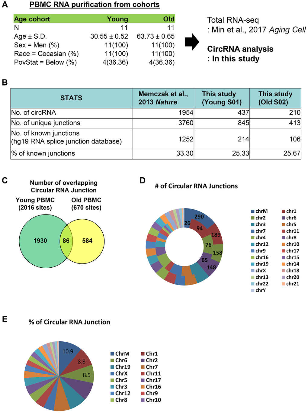 To better understand the function of circular RNA during mammalian aging, we analyzed circular RNA junctions by using total RNAs purified from 11 young and 11 old individuals (Figure 1A). Peripheral blood mononuclear cells (PBMCs) were donated by Caucasian males with the mean age of the “young” groups being 30.55 (±0.52) and, for the “old” group, 63.73 (±0.65) [3]. We purified total RNAs from the PBMCs, fragmented them, generated cDNA libraries, and sequenced them as detailed in our previous study [3].