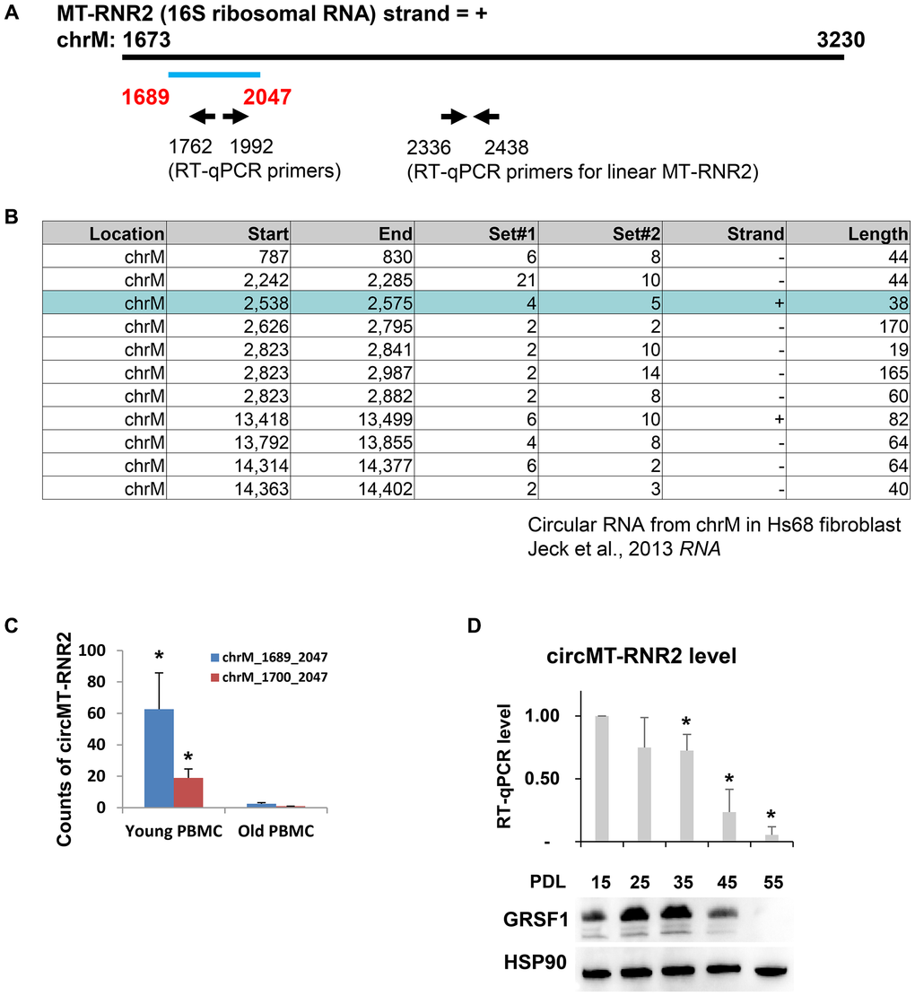 As previously reported in Jeck et al., there are various species of circular RNA junctions mapped to the mitochondrial genome [13]. Heavy strand of mitochondrial genome from Hs68 fibroblast produces a circular RNA junction, chrM: 2,538-2,575, within the MT-RNR2 locus with no overlap with the junction that we identified from human PBMCs (Figure 2B). In previous publication [13], the authors detected only 1 species of circMT-RNR2 (chrM:2538-2575) from positive strand while the others are produced from negative strand (including chrM:2242-2285). However, we could not detect the circular RNA from the positive strand of chrM:2538-2575 possibly due to difference in cell types or sequencing depth. When we compared the abundance of circular RNA junctions in PBMCs RNA, we observed that there is a sharp decline in the counts of 2 circular RNA junctions from PBMCs during human aging (Figure 2C). During the process of replicative senescence in human diploid fibroblasts, WI-38, the level of circMT-RNR2 declined together with senescence-suppressing RNA-binding protein GRSF1 (Figure 2D). Taken together, our analysis demonstrates that human PBMCs produce circular RNAs from MT-RNR2, which is distinct from human fibroblasts.
