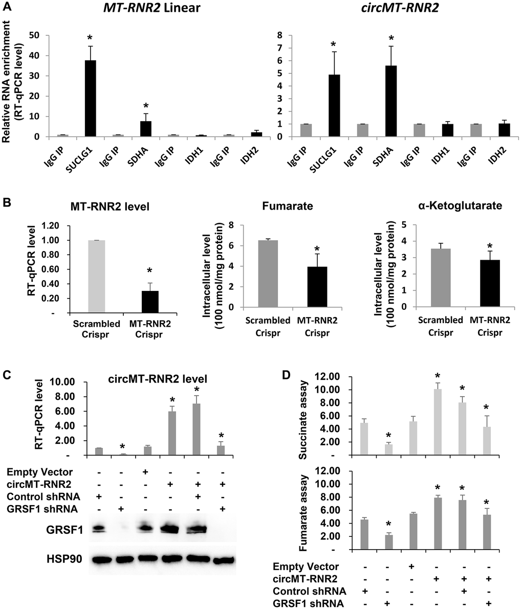 As previously profiled from polyA-tailed RNA pull down [18–20], a series of metabolic enzymes are also pulled down together with polyA-tailed mRNAs. Those proteins include SUCLG1, SDHA, IDH1/2, and we examined their binding with linear and circular forms of MT-RNR2 from immunoprecipitation of these proteins from human fibroblast (WI-38) lysates. Our Ribonucleoprotein (RNP) immunoprecipitation assay revealed that SUCLG1 and SDHA pulled down together with both linear and circular MT-RNR2 (Figure 4A).