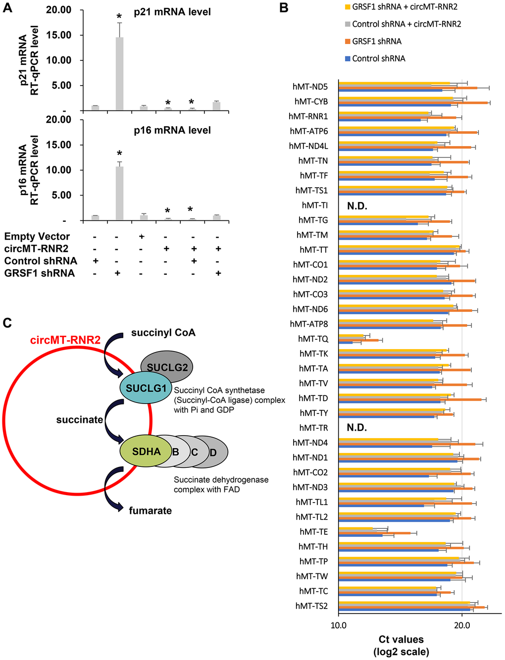 Since depletion of GRSF1 accelerates senescence and suppresses mitochondrial function as well as circMT-RNR2 production, we further manipulated the levels of GRSF1 and circMT-RNR2 in WI-38 cells and then compared the levels of p16/p21 mRNA as a marker of cellular senescence (Figure 5A). While GRSF1 depletion accumulates p16 and p21 mRNAs in WI-38 cells, re-introduction of circMT-RNR2 successfully rescue the level of p16 and p21 mRNAs similar to control shRNA-treated cells. In addition, GRSF1 silencing globally decreased the levels of mitochondrial transcripts but re-introduction of circMT-RNR2 partially rescued this defect in WI-38 cells as a snapshot of mitochondria homeostasis. (Figure 5B) These results demonstrate that GSRF1 facilitates production of circMT-RNR2 to accelerat TCA cycle and preserve proliferating status of fibroblasts and maintain mitochondrial function (Figure 5C). Possible molecular mechanisms will be discussed in detail below.